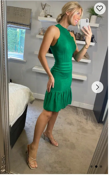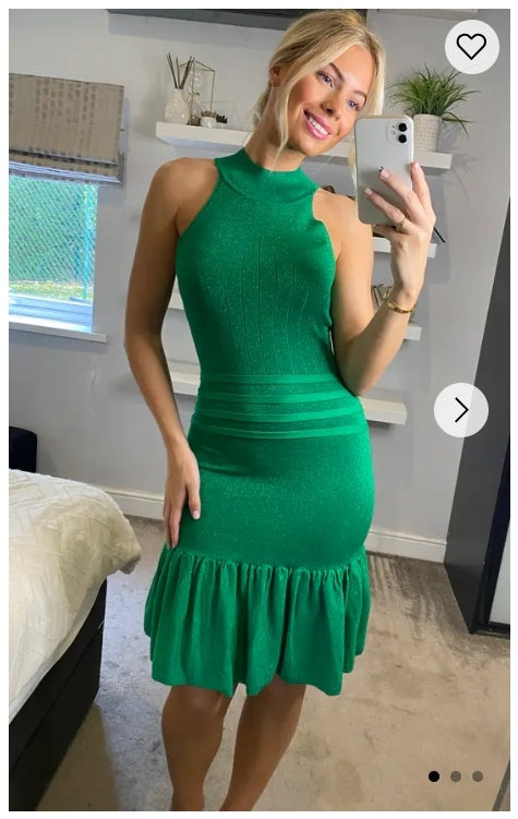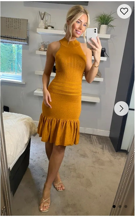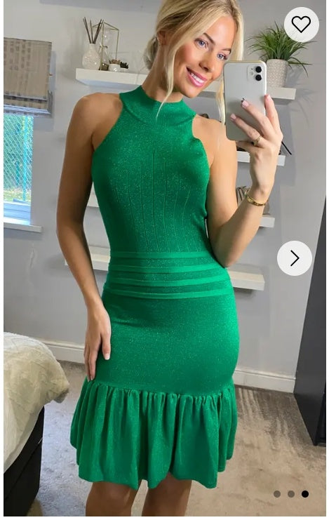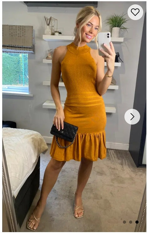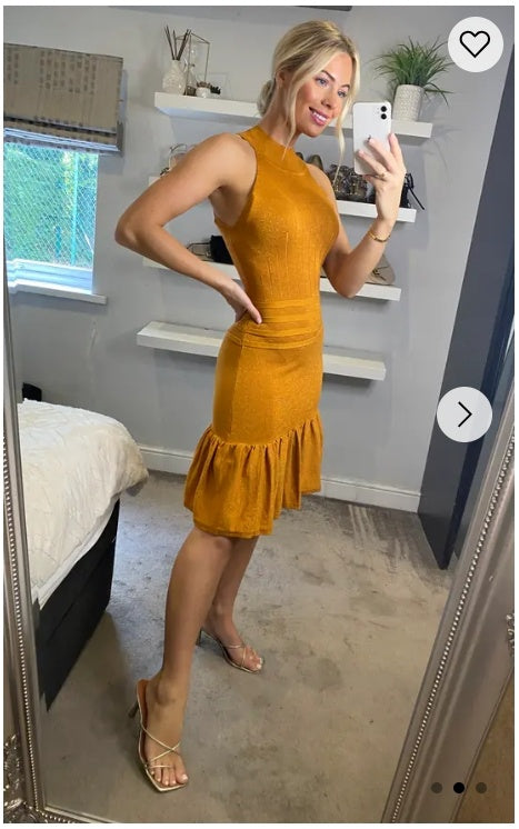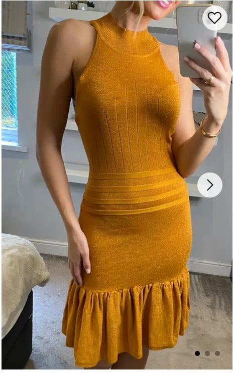 High Neck Pleated Metallic Dress Knee Length In Gold