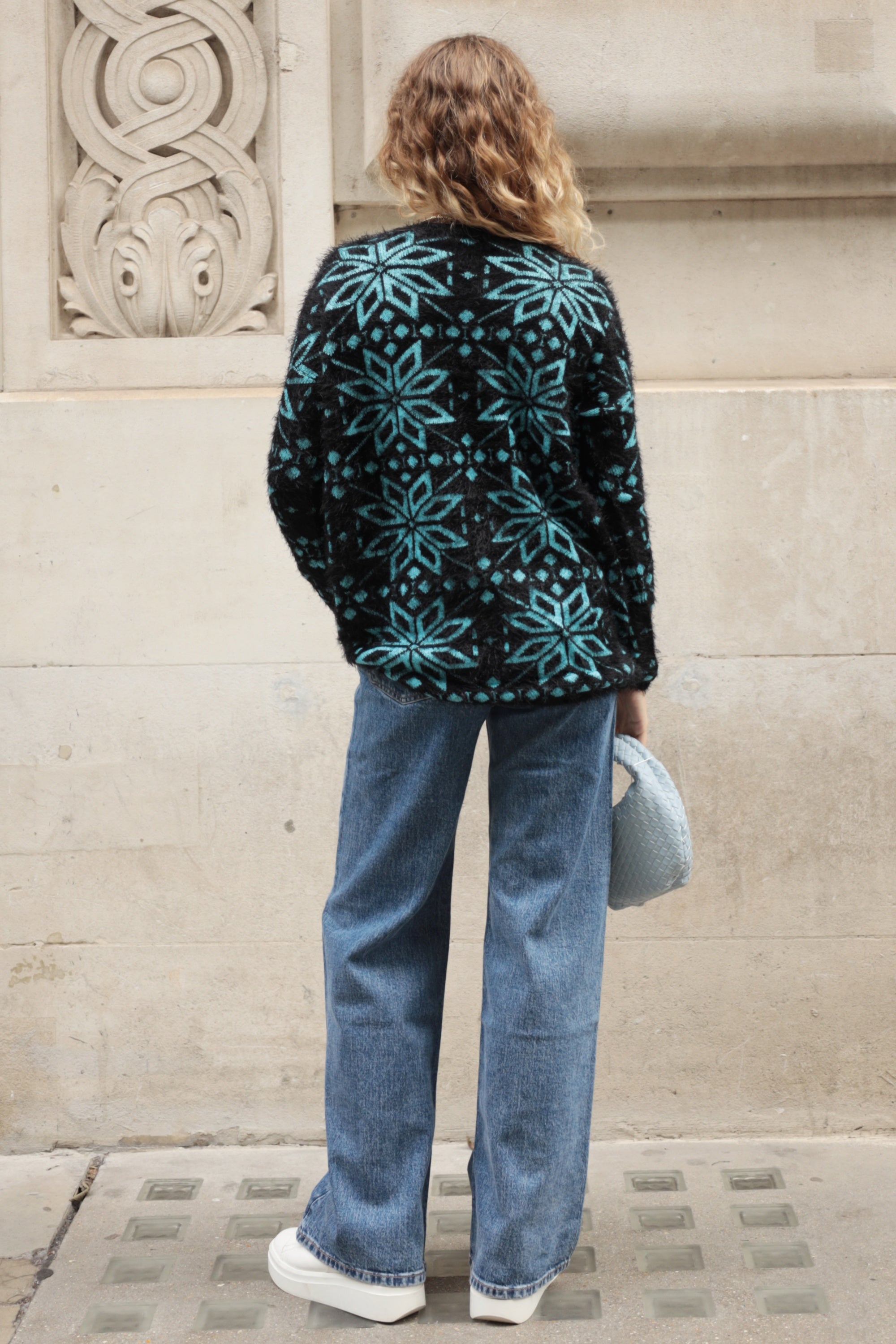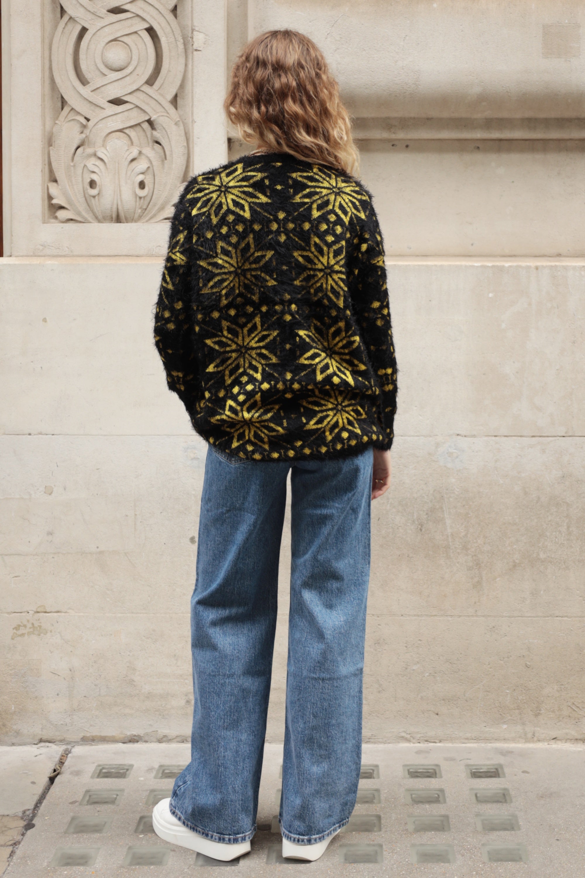 Metallic Gold Trims Stripe And Diamond Print Wool Blend Knitted Cardigan
