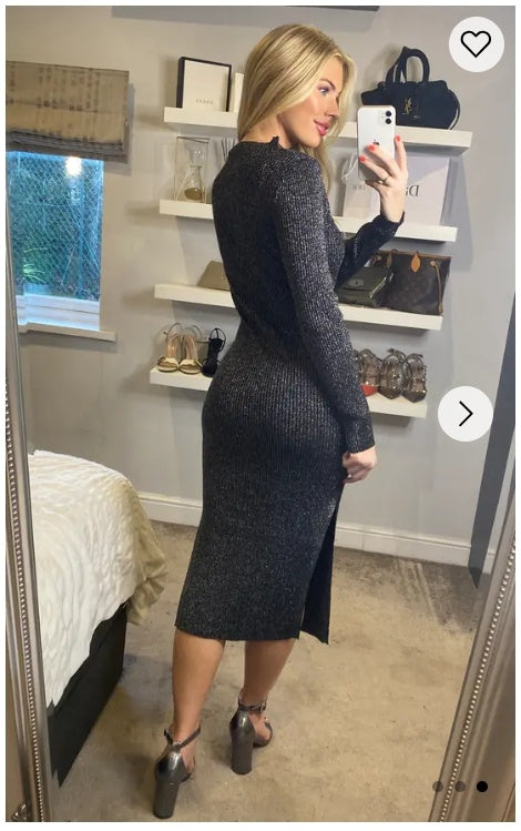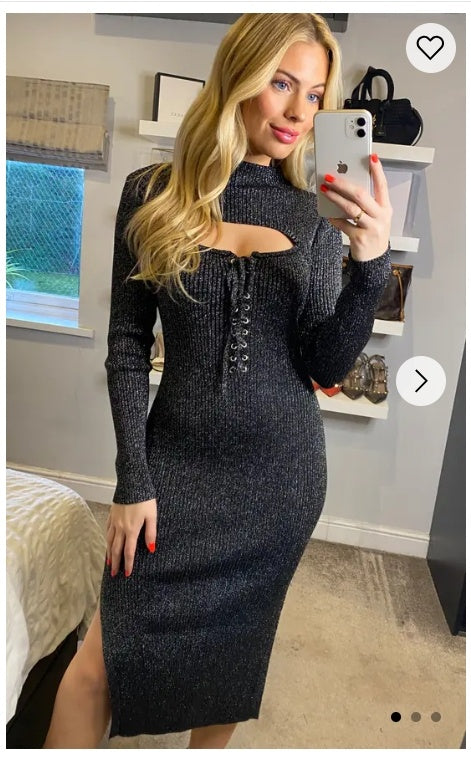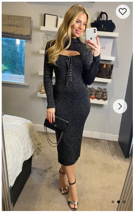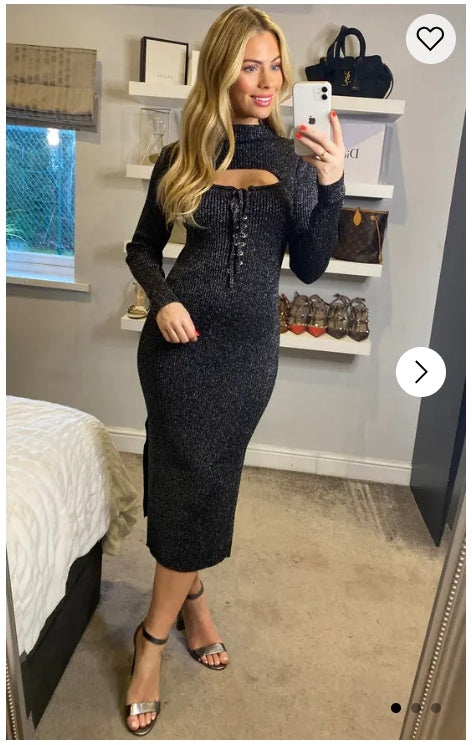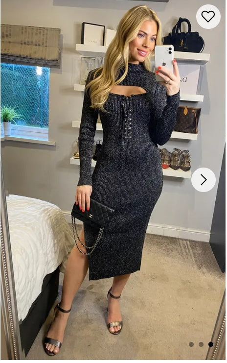 Lace up and cut out design Metallic midi bodycon dress in Black