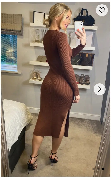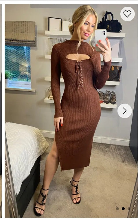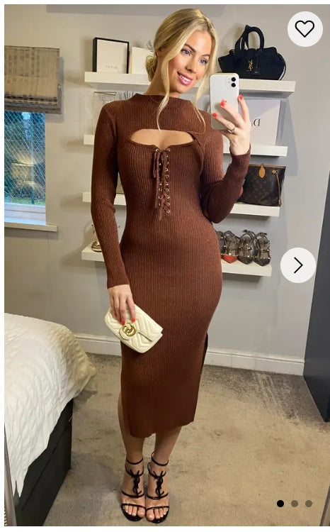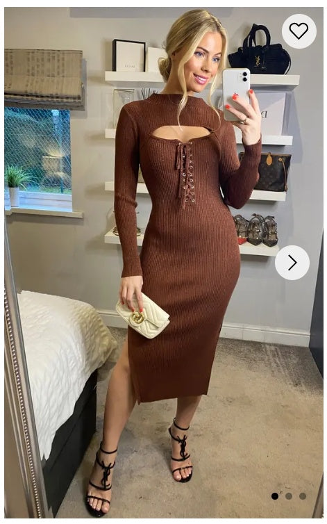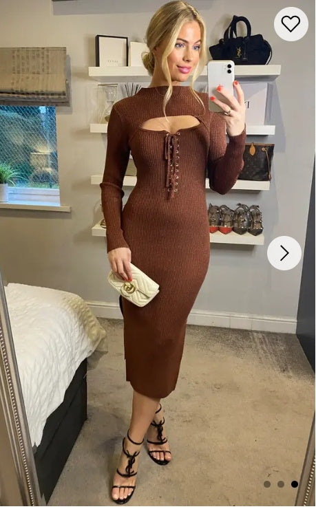 Lace up and cut out design Metallic midi bodycon dress in Brown