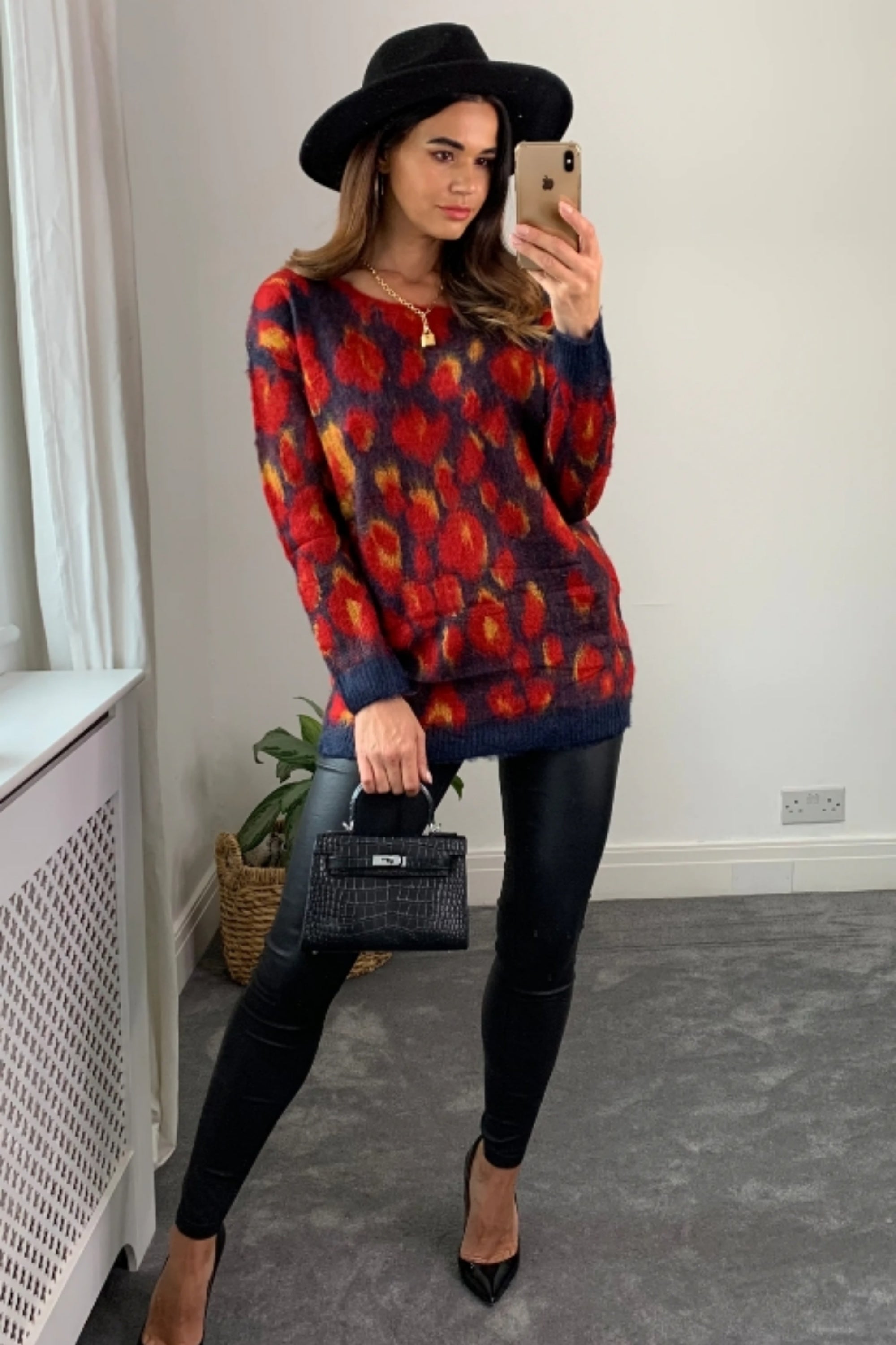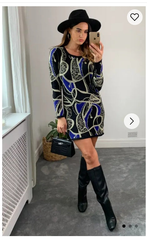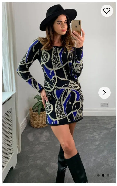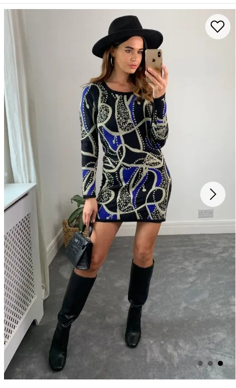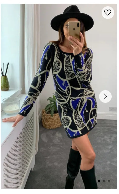 Knitted Bodycon Dress with Metallic Gold/Blue Abstract Print
