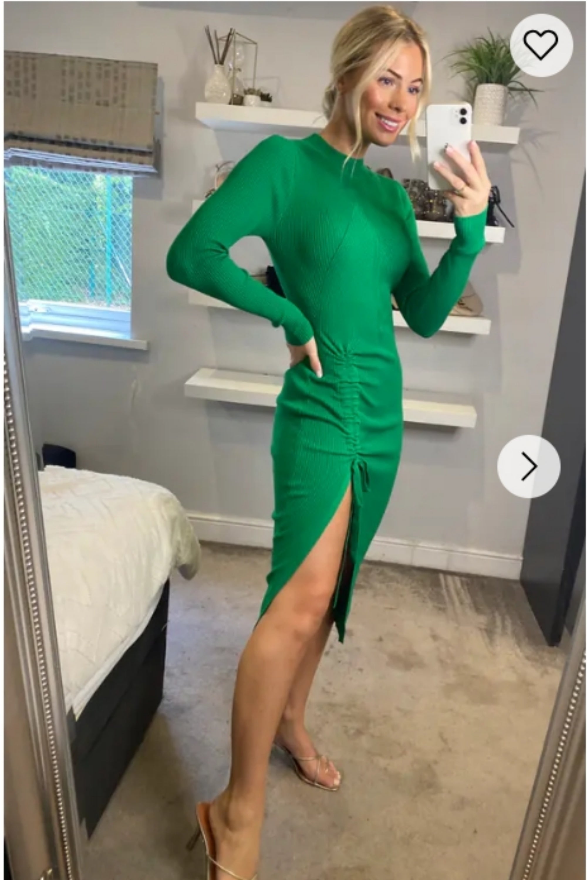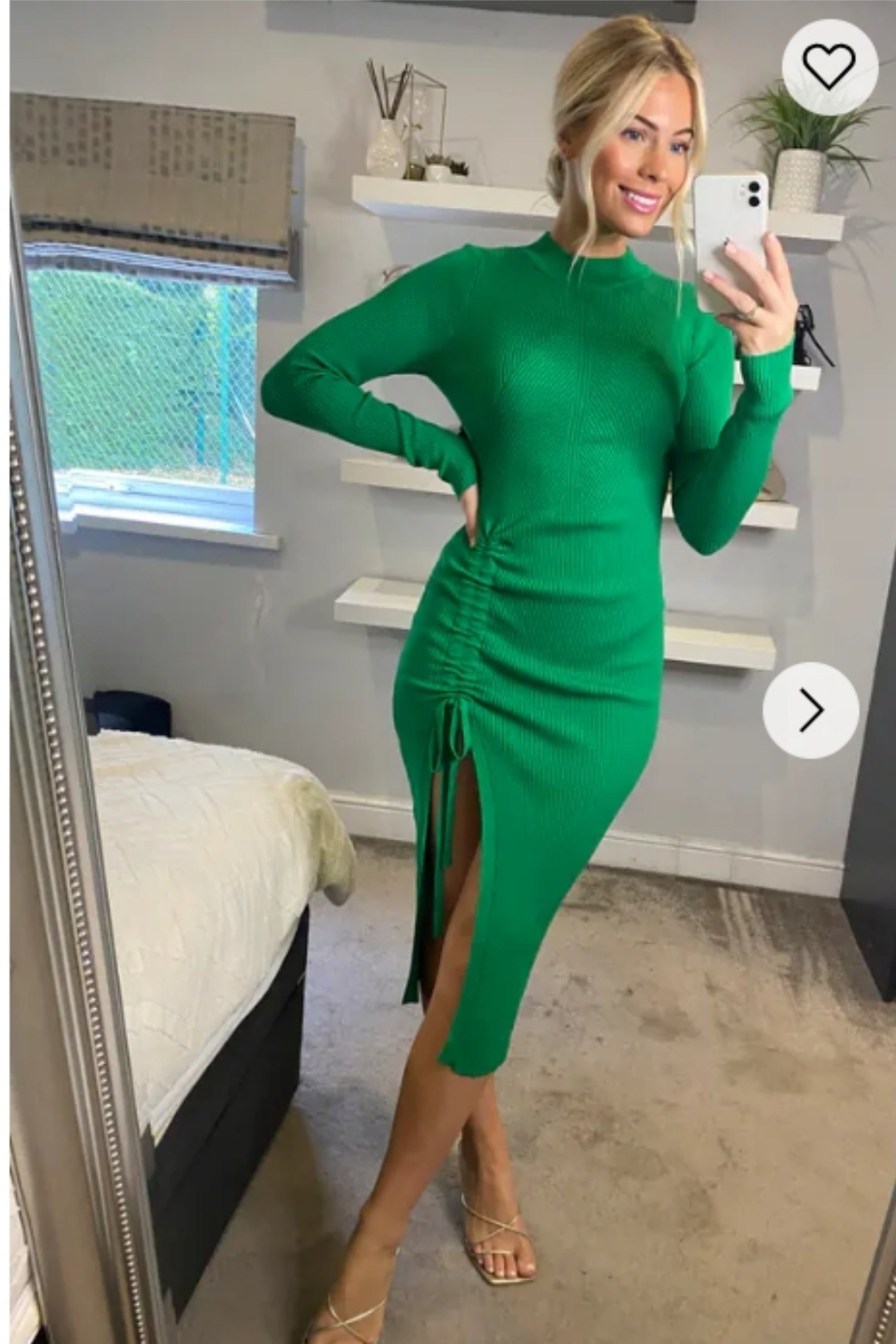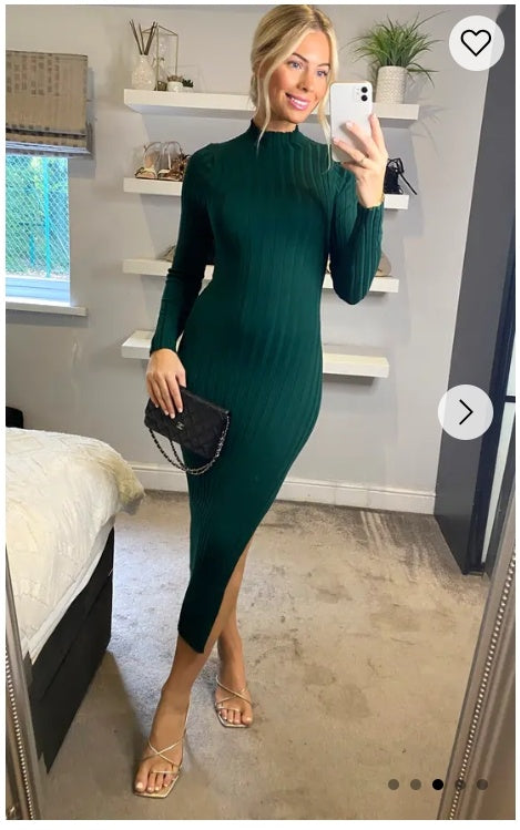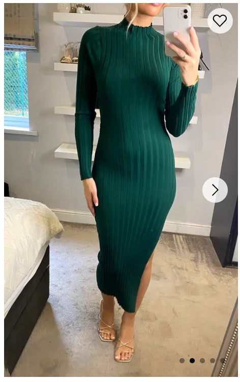 Soft Knitted Ribbed Midi Bodycon Dress Long Sleeve In Green