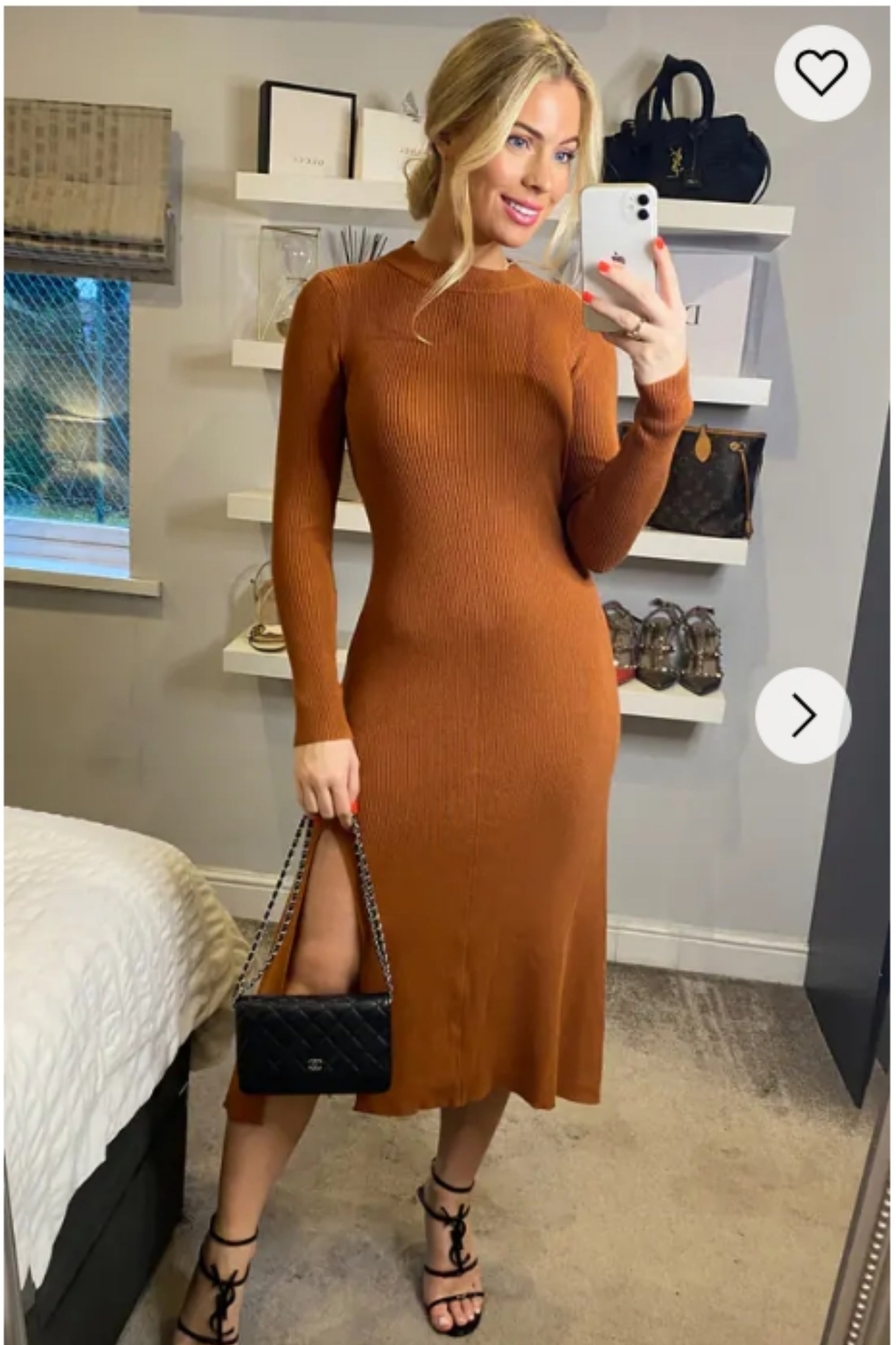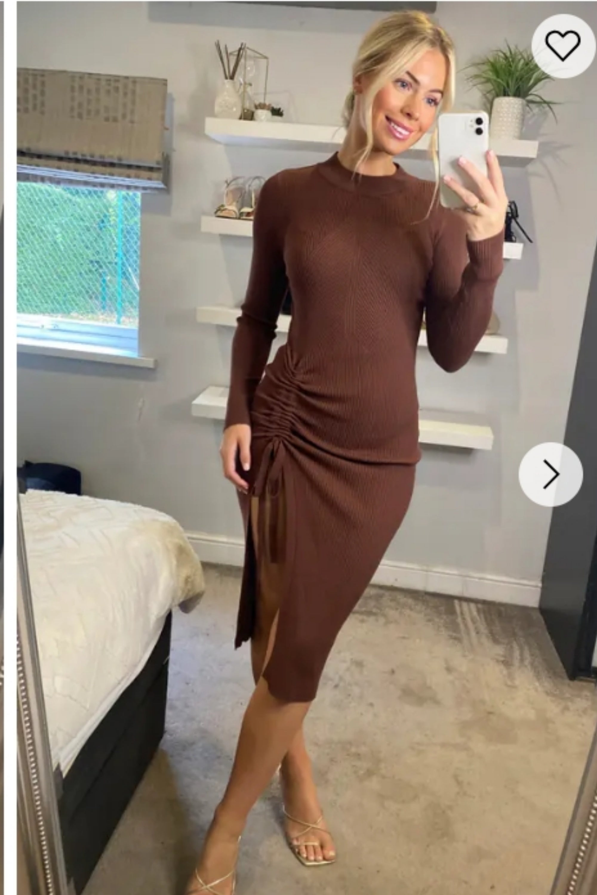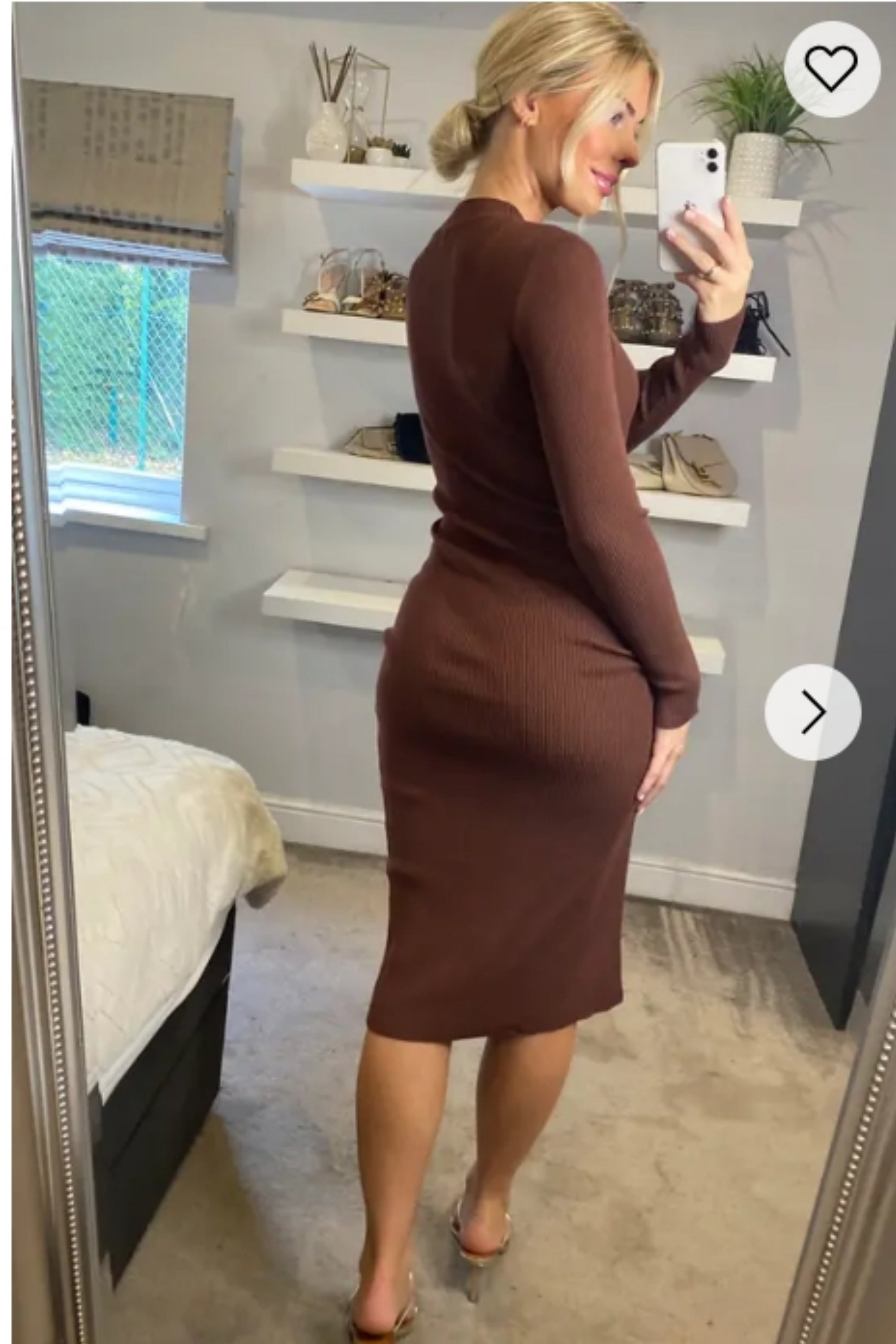 Soft Knitted Ribbed Midi Bodycon Dress Long Sleeve In Brown