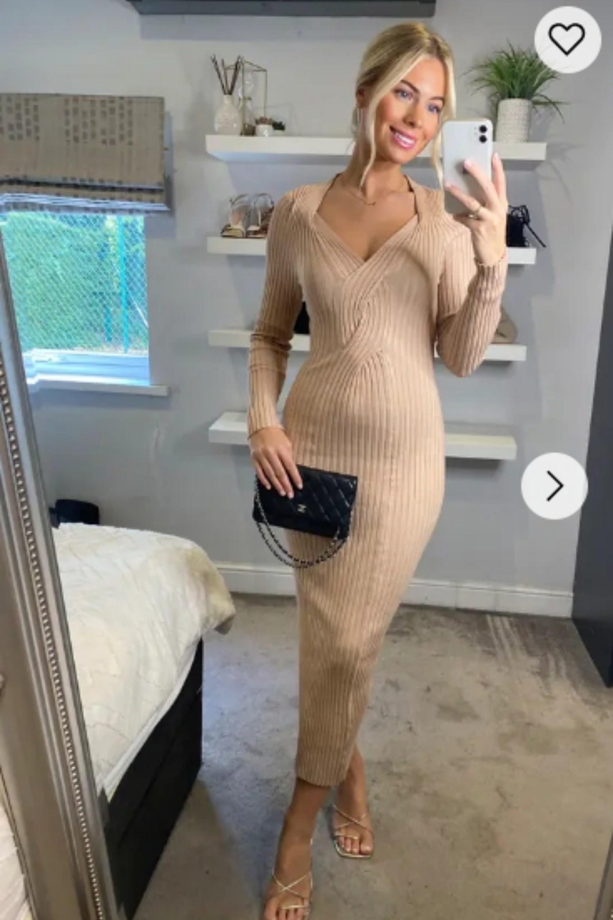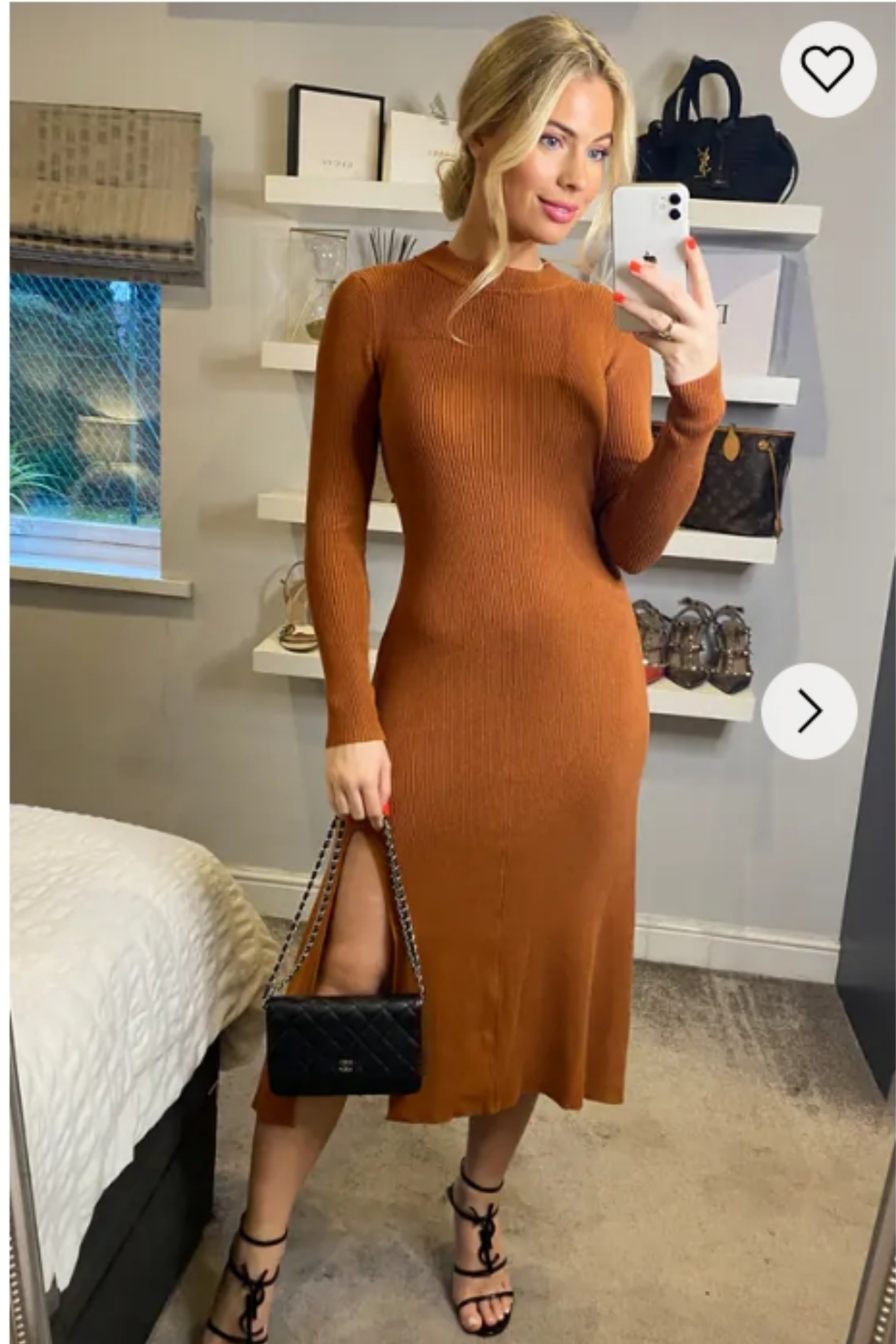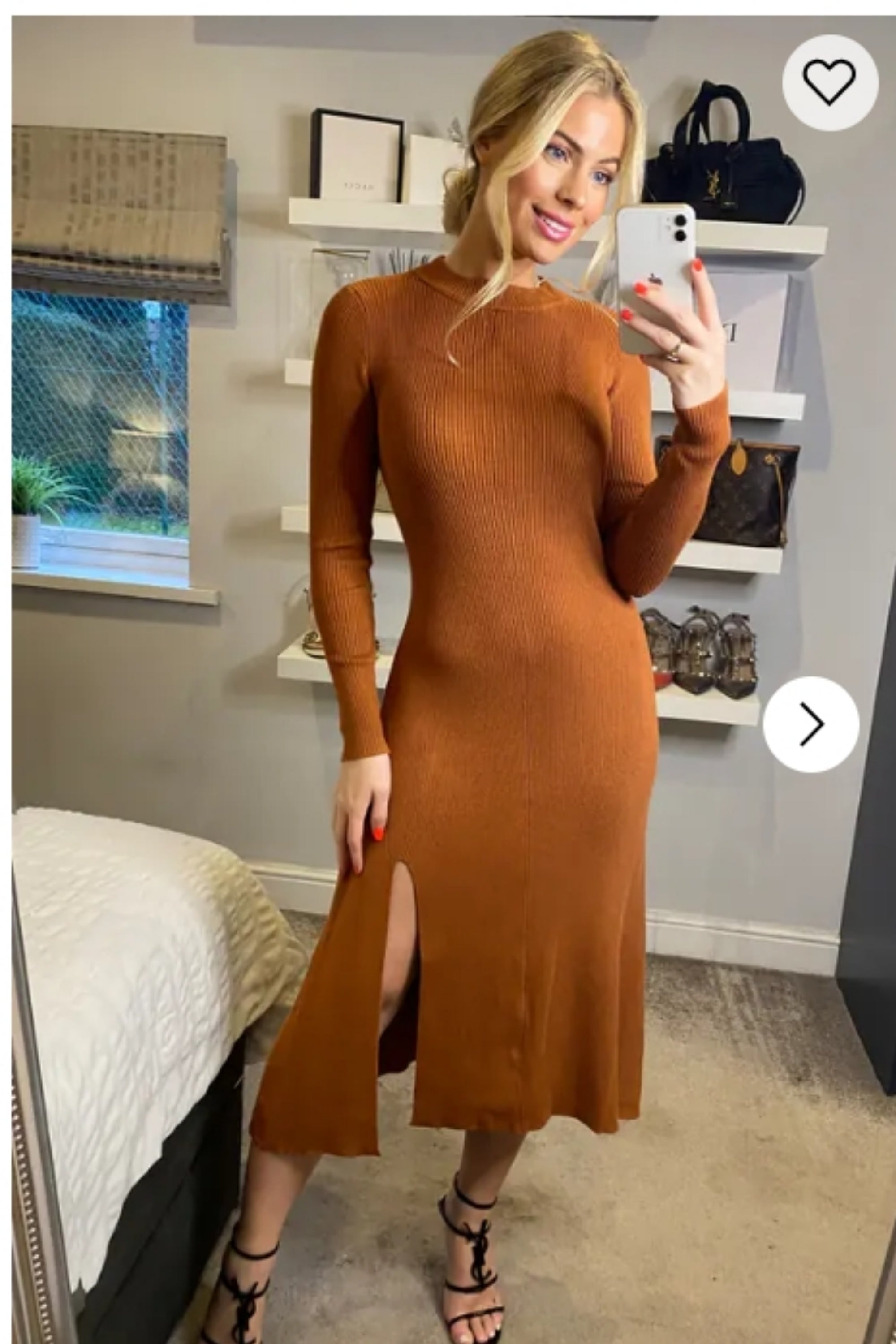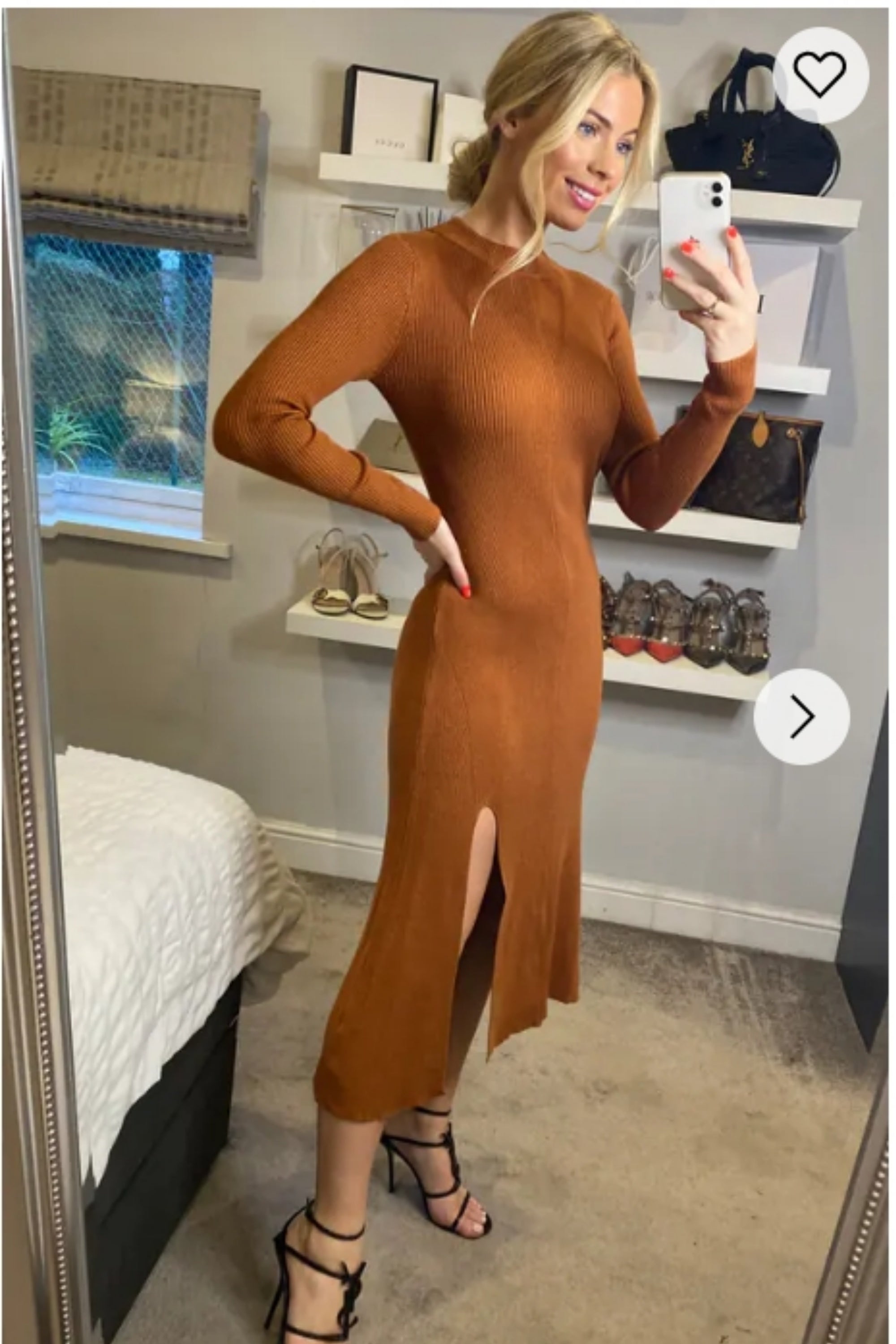 Soft Knitted Ribbed Midi Bodycon Dress Long Sleeve In Brown