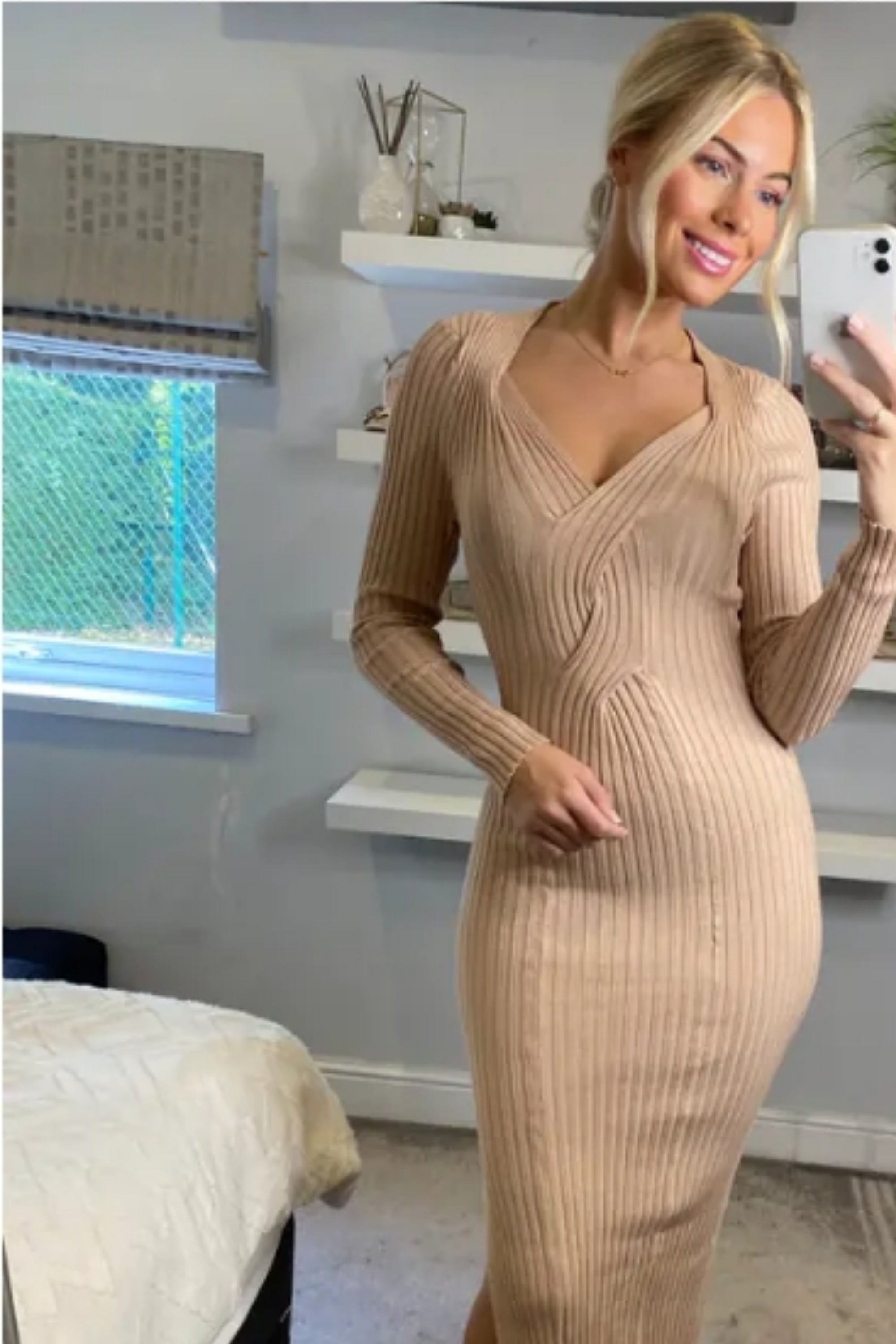 Soft Knitted Ribbed Midi Bodycon front twist design Dress In Beige