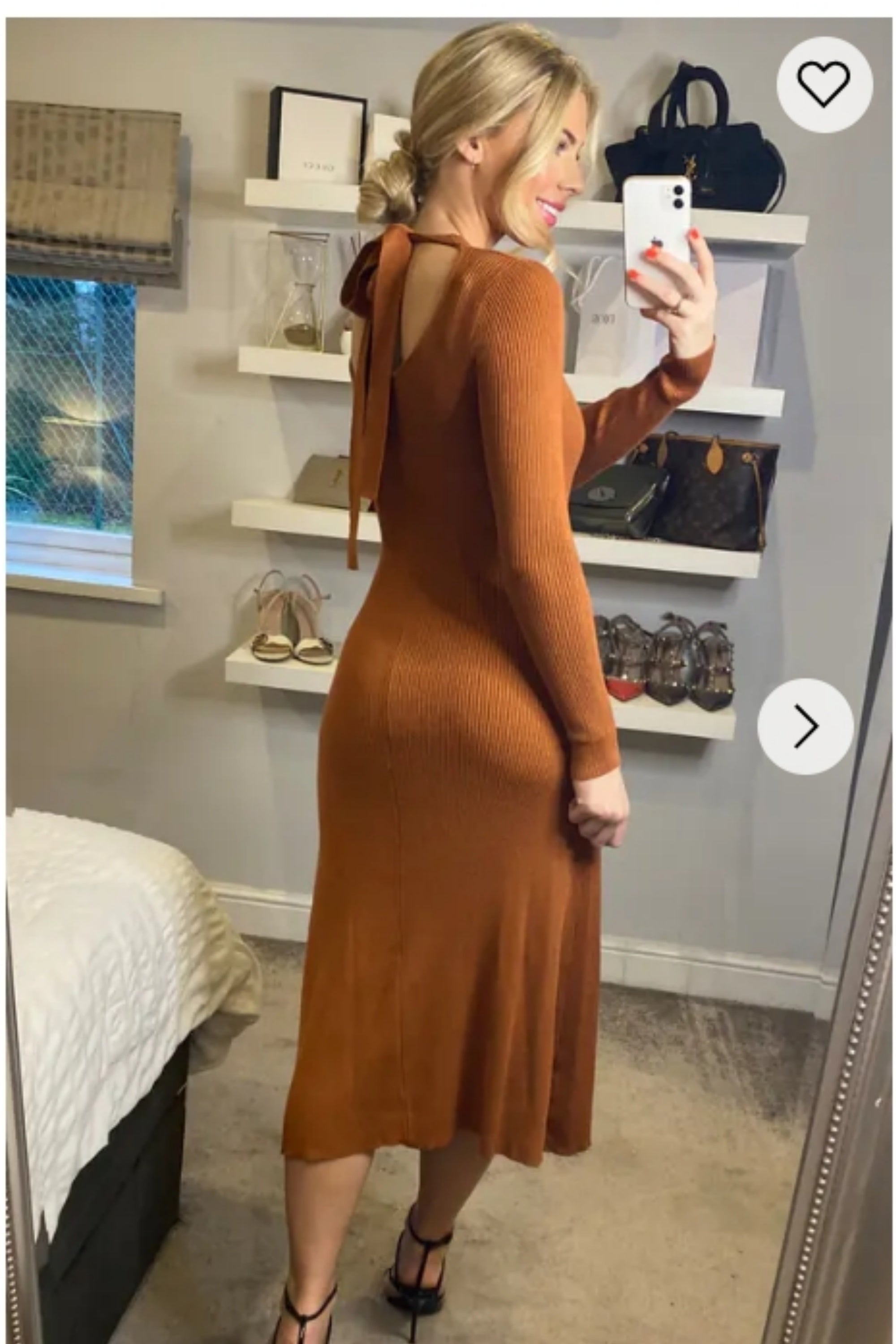 Soft Knitted Ribbed Midi Bodycon Dress tie up on back In Brown