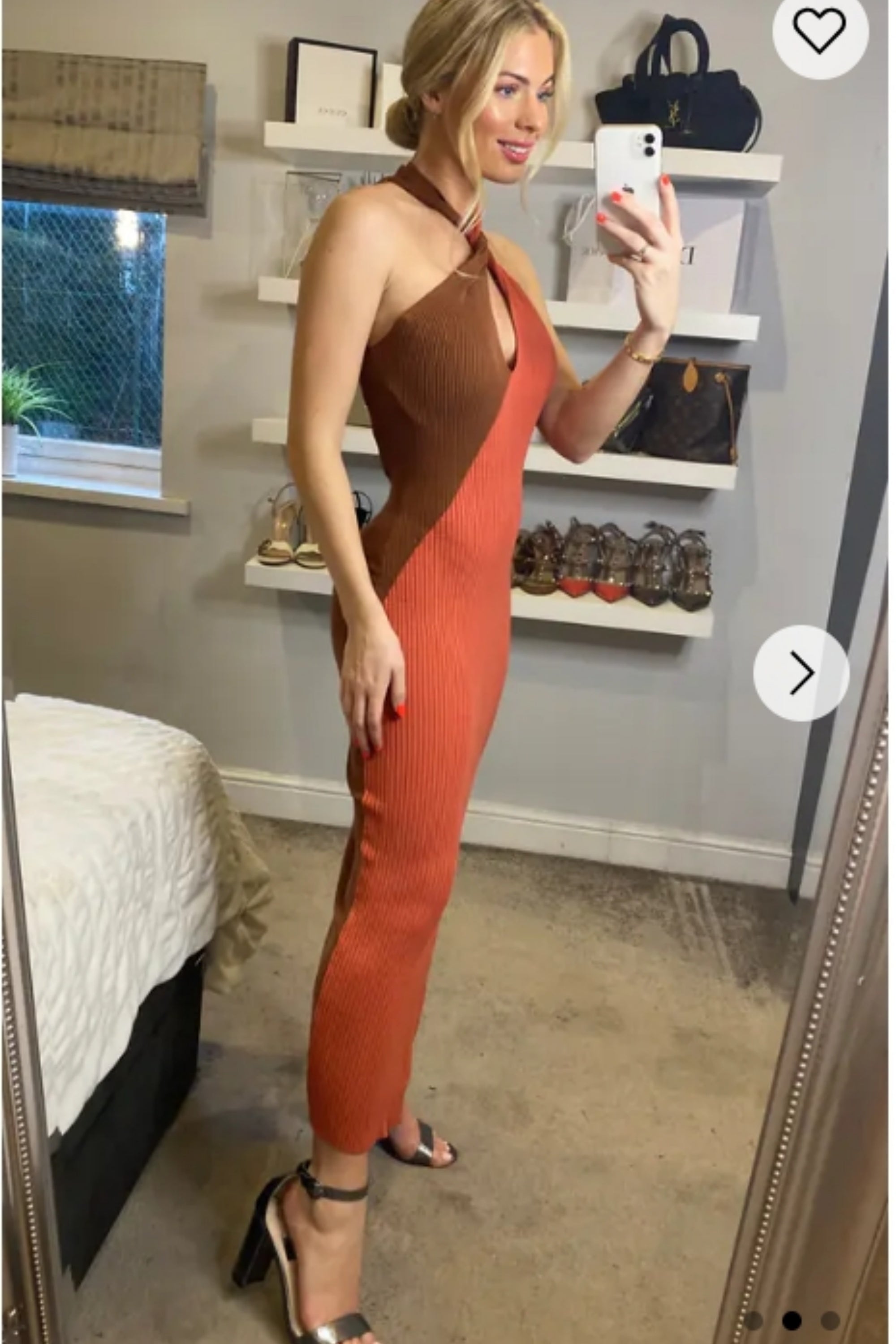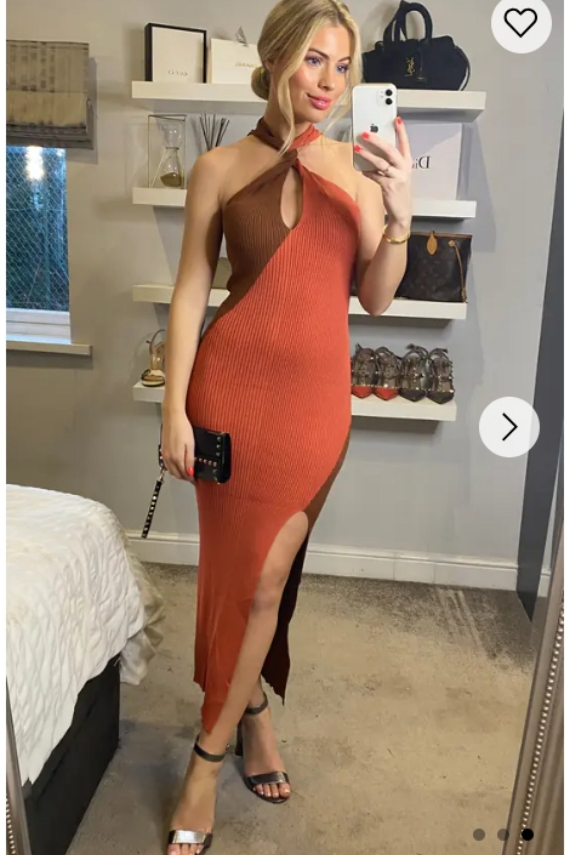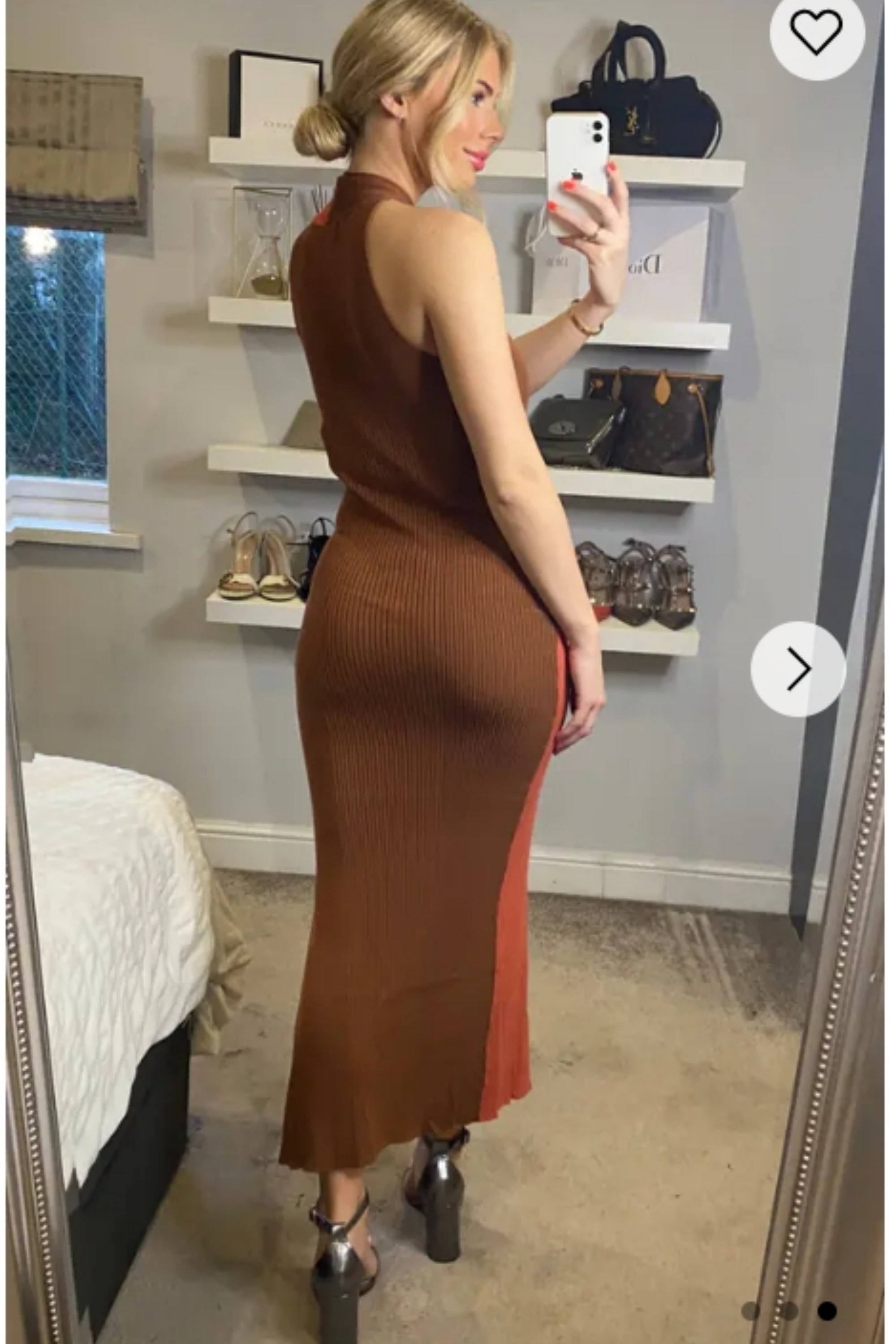 Soft Knitted Ribbed Midi Bodycon twist neck Dress In Brown coffee Contrast
