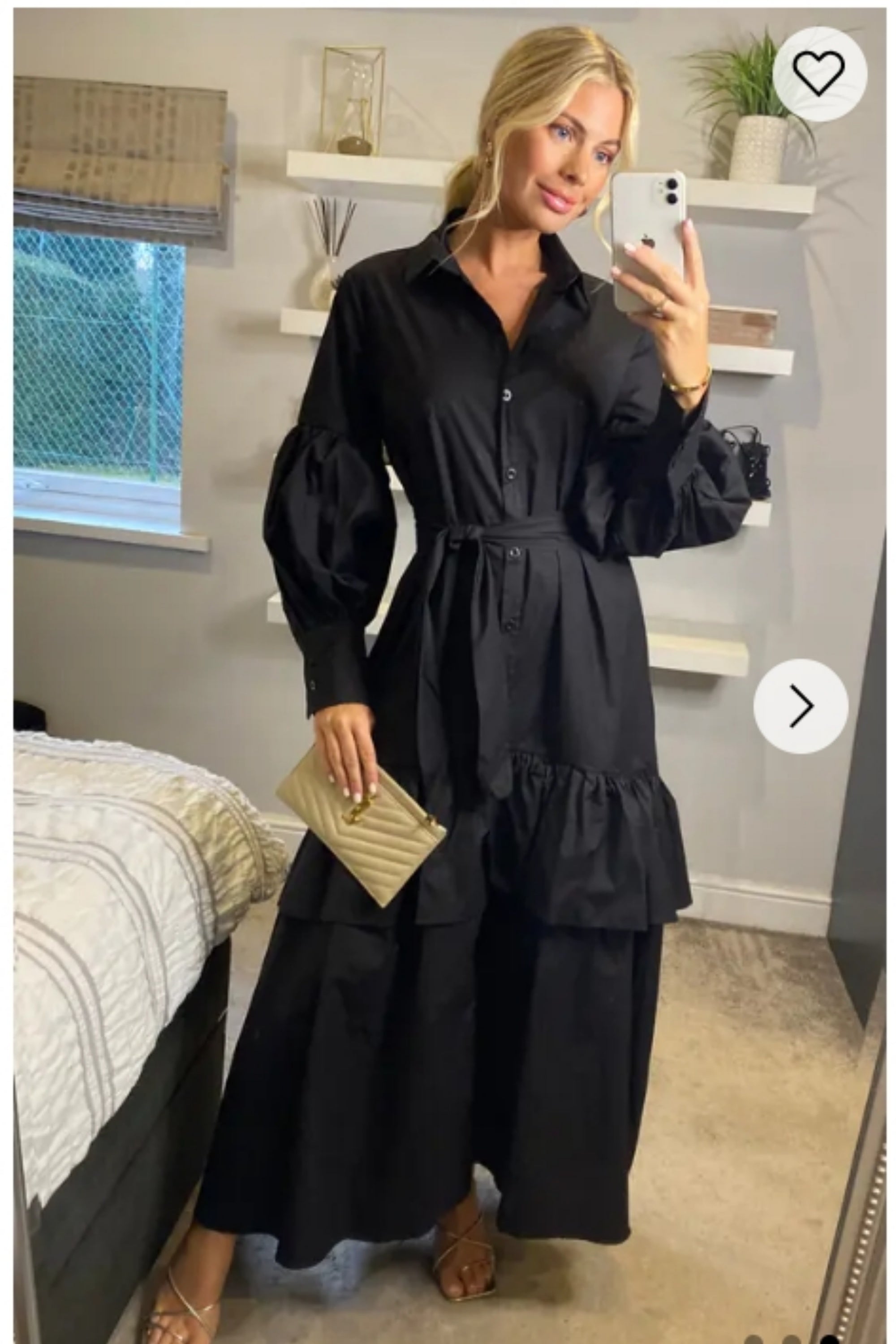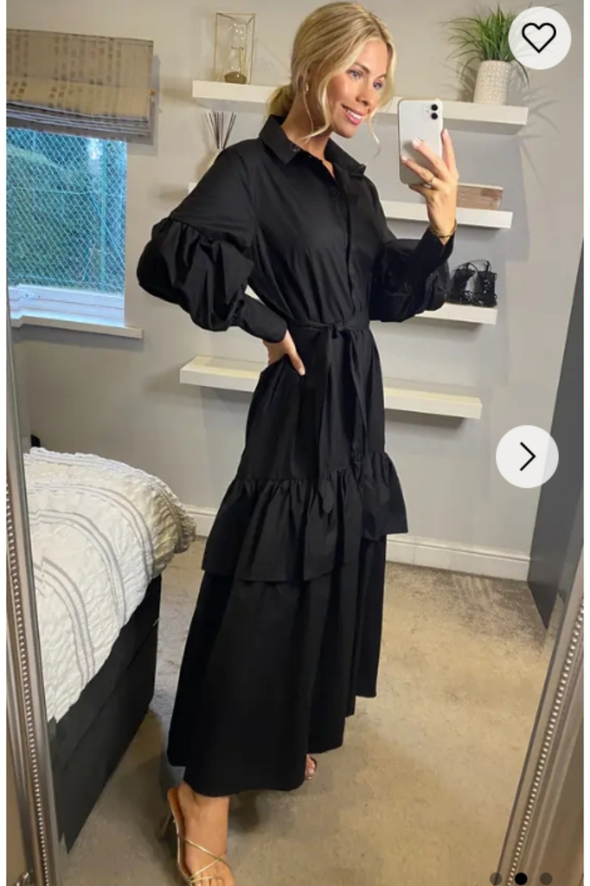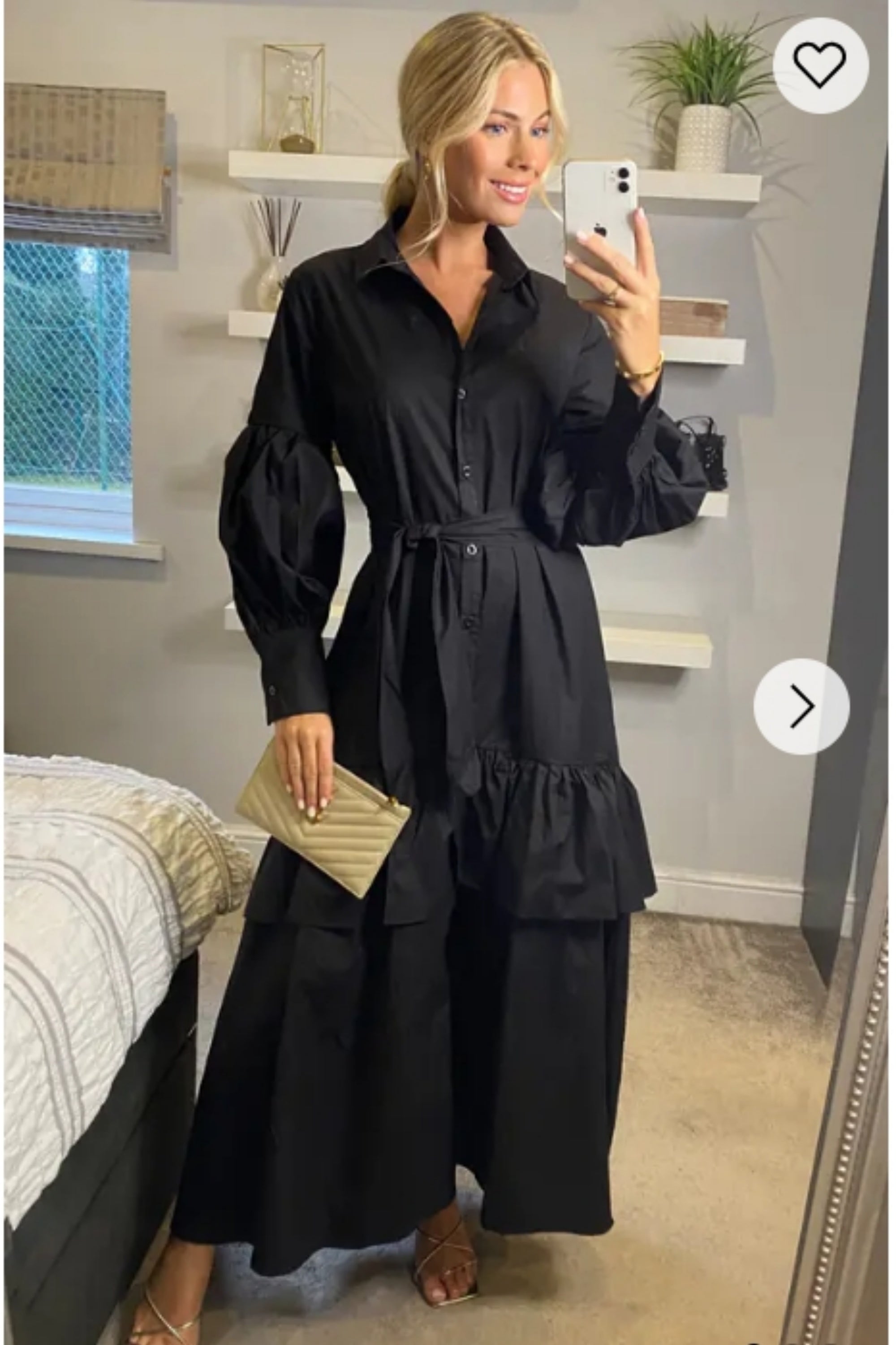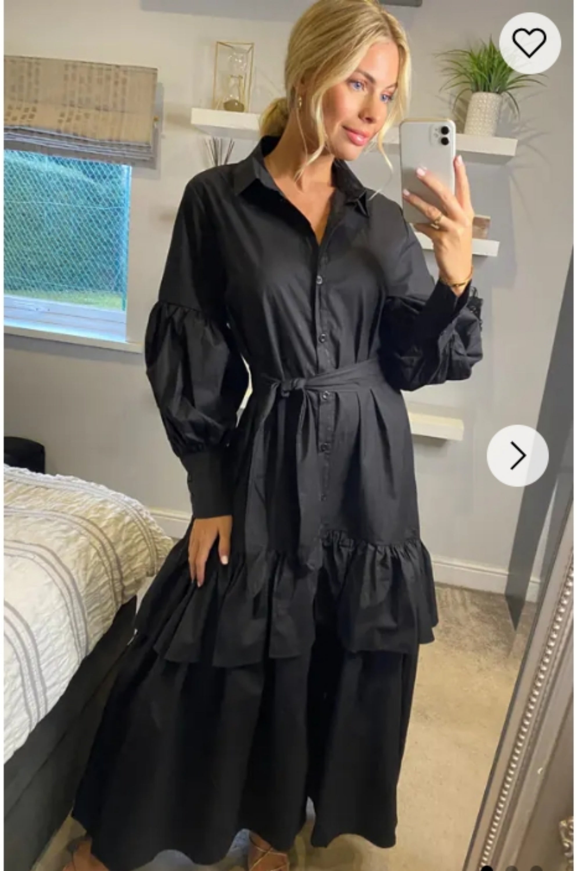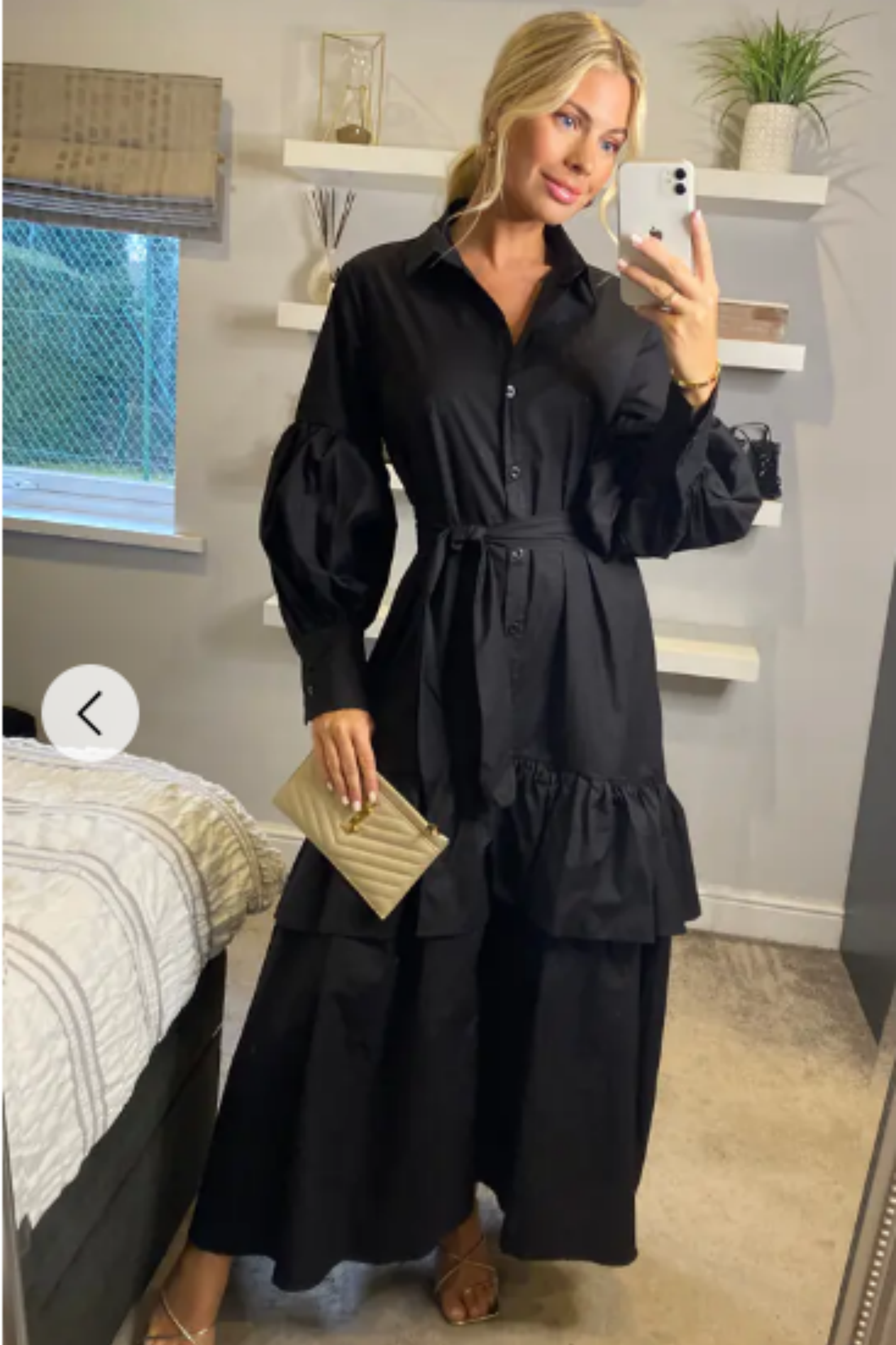 Oversized Ballon sleeves with tie up cotton blend shirt dress in black