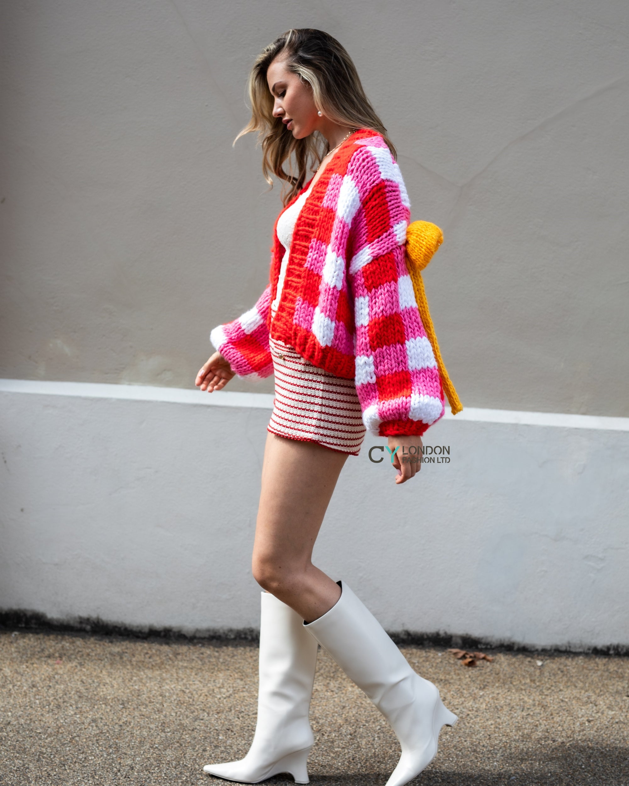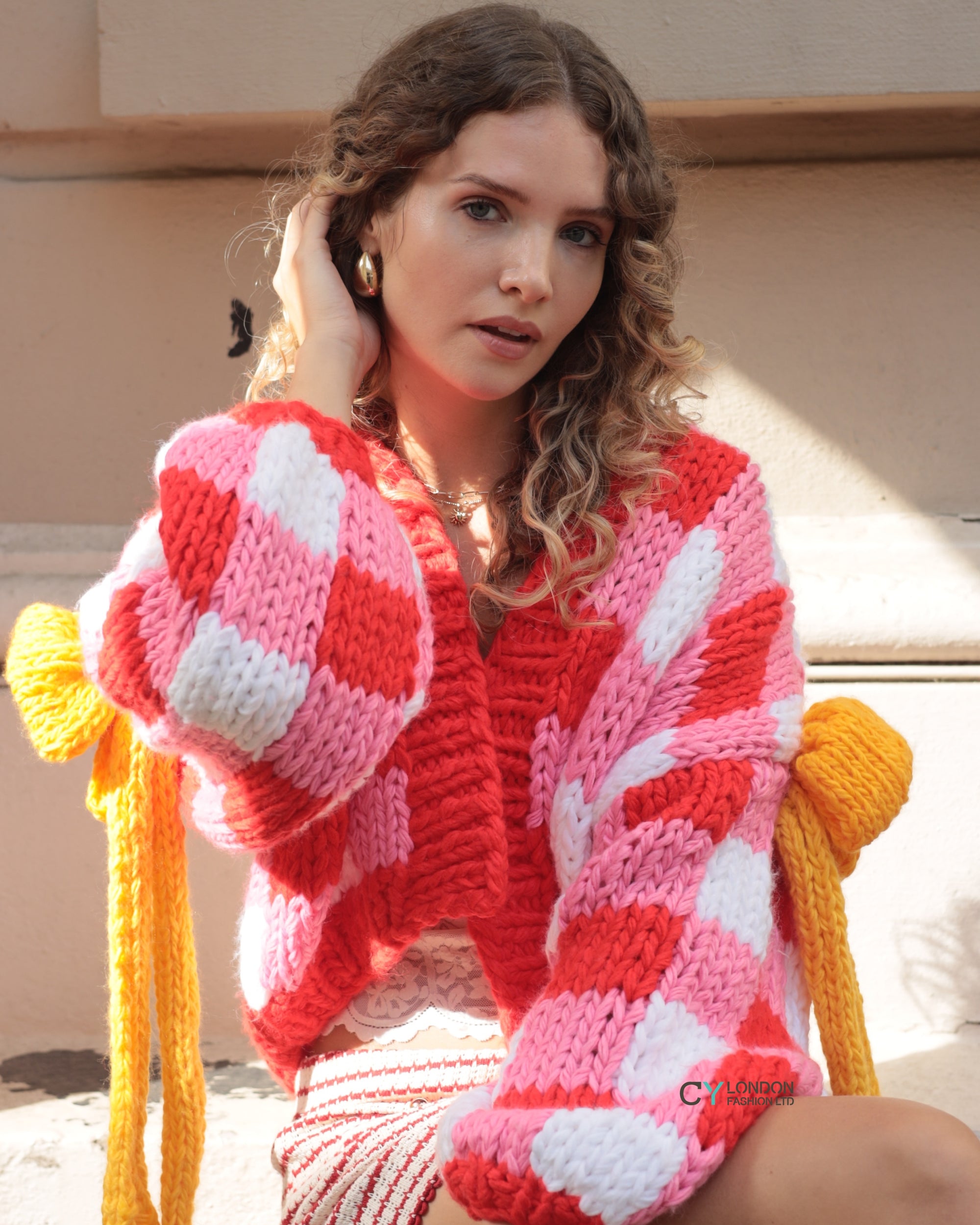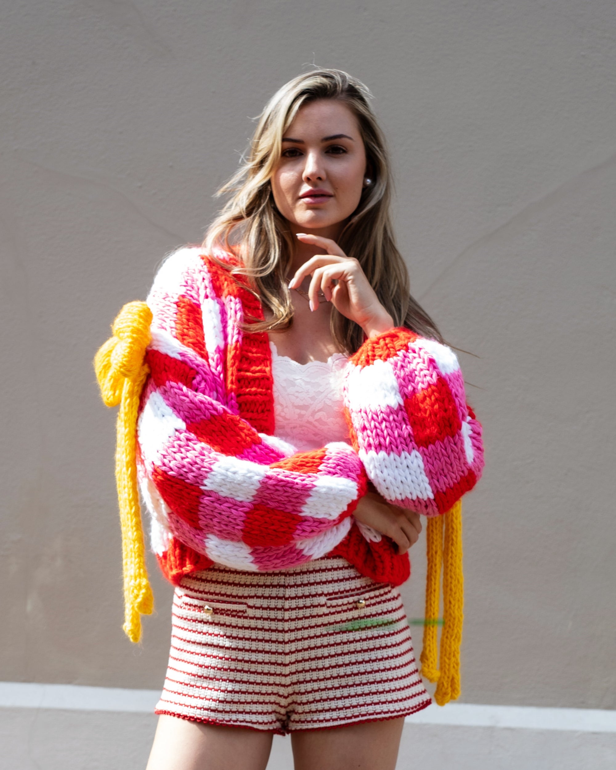 Red White Checked Print Pattern with Big Bow design Hand Knit Cardigan