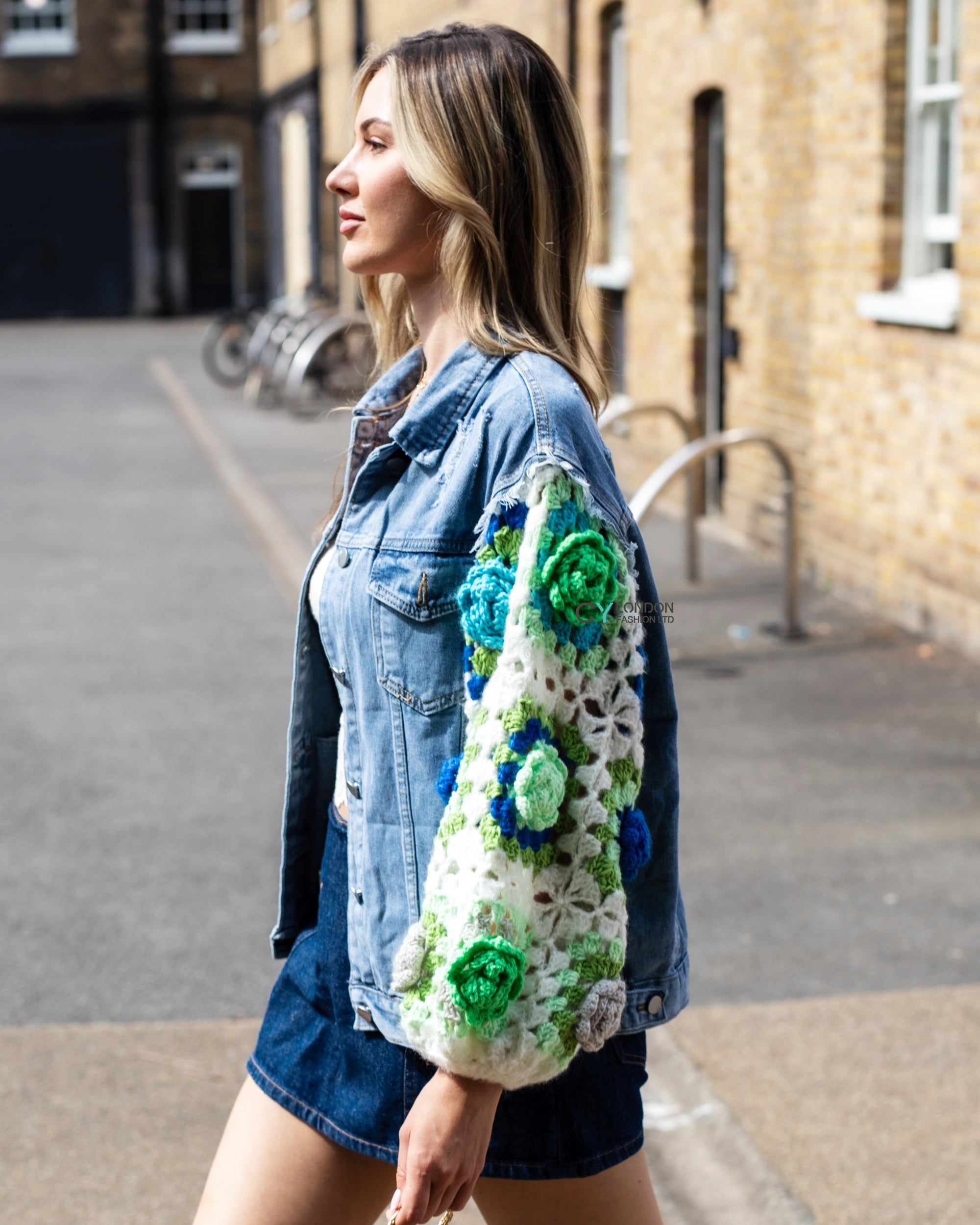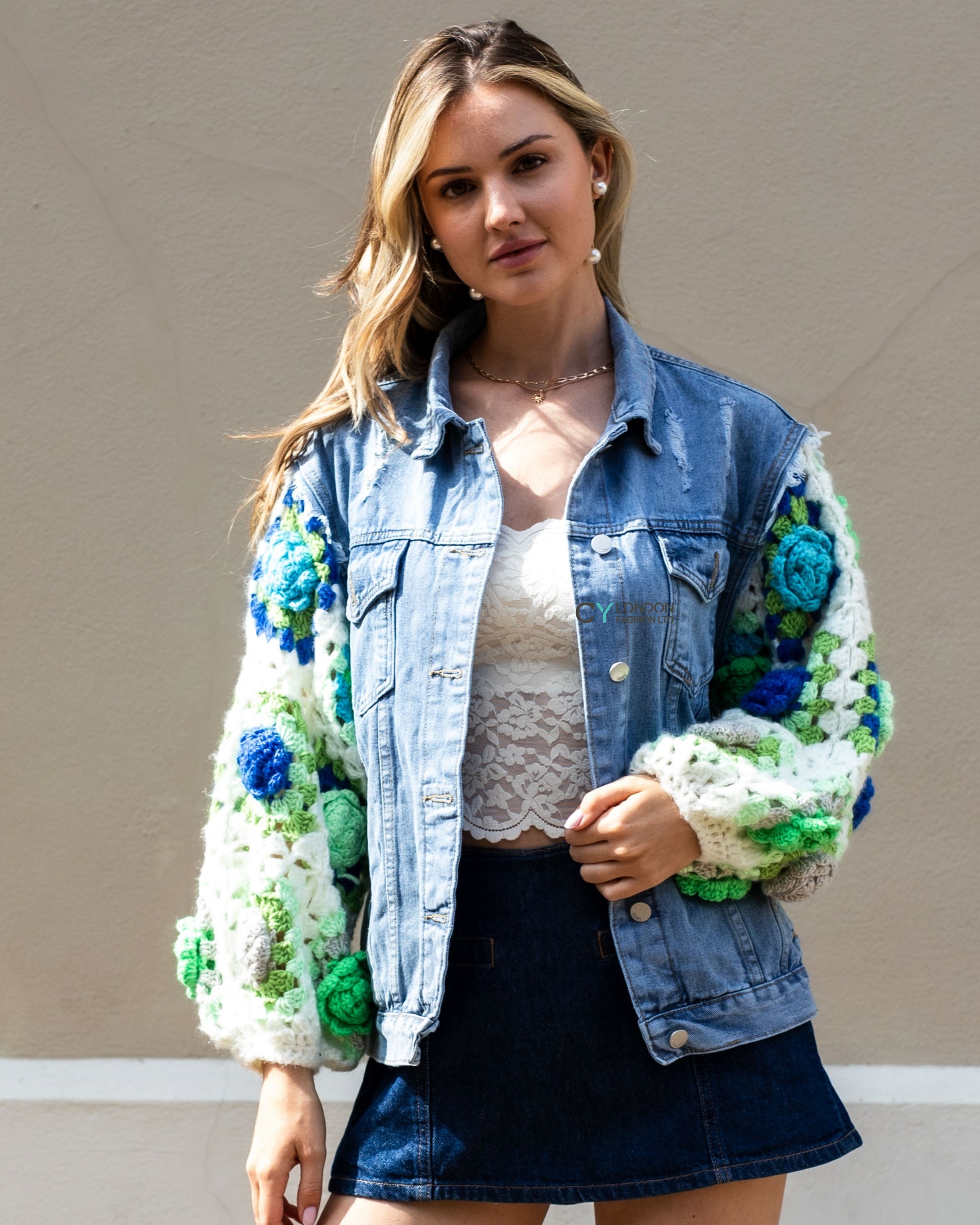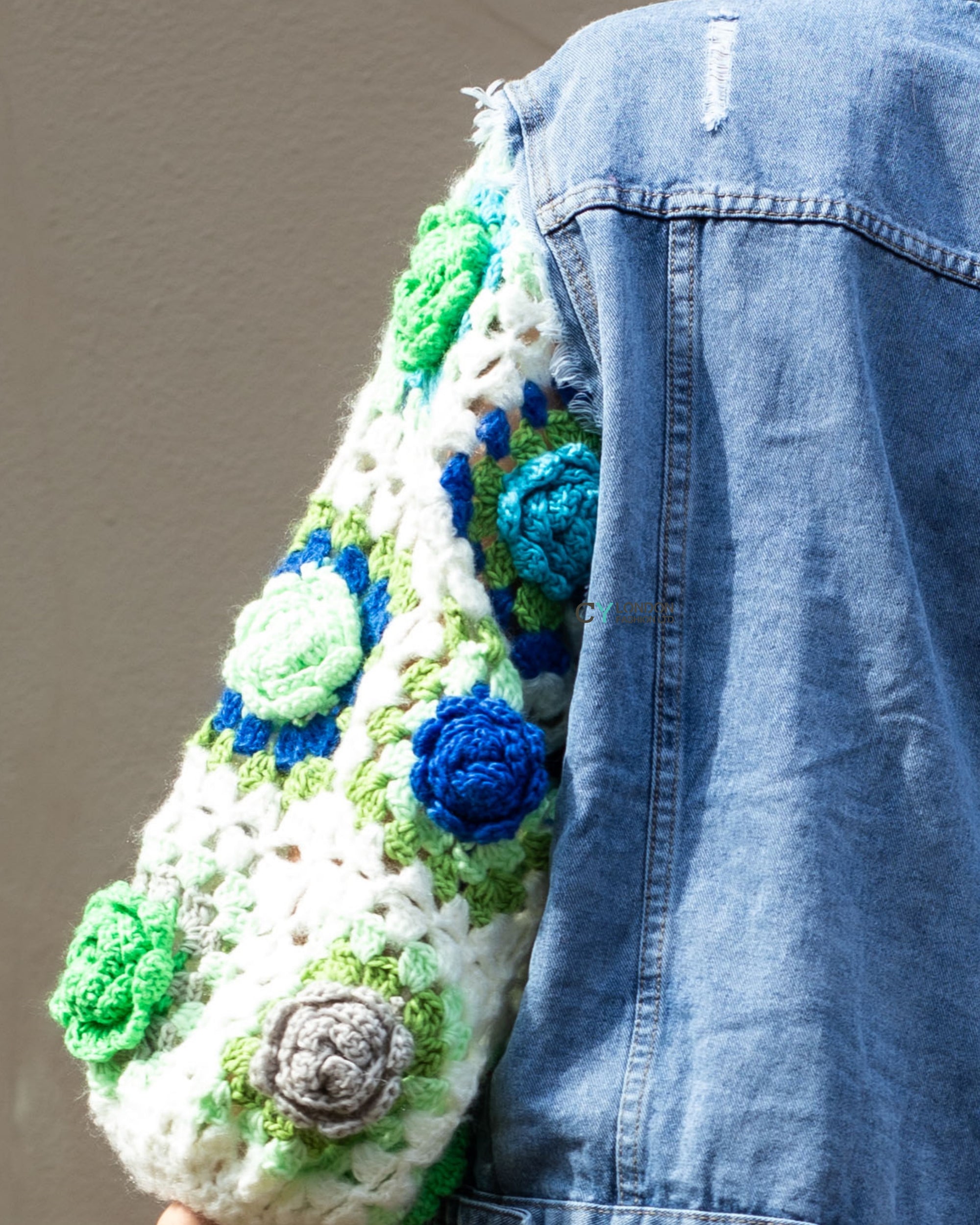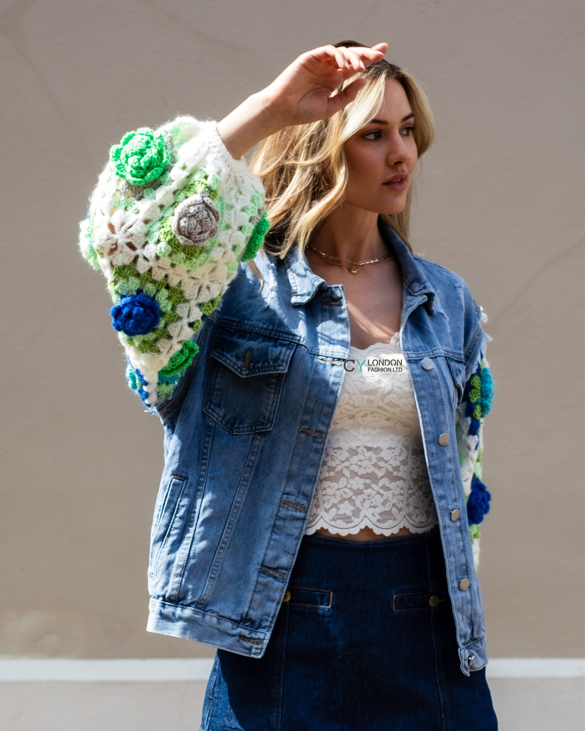 Handknit Floral Patten Sleeves Denim Jacket in Green