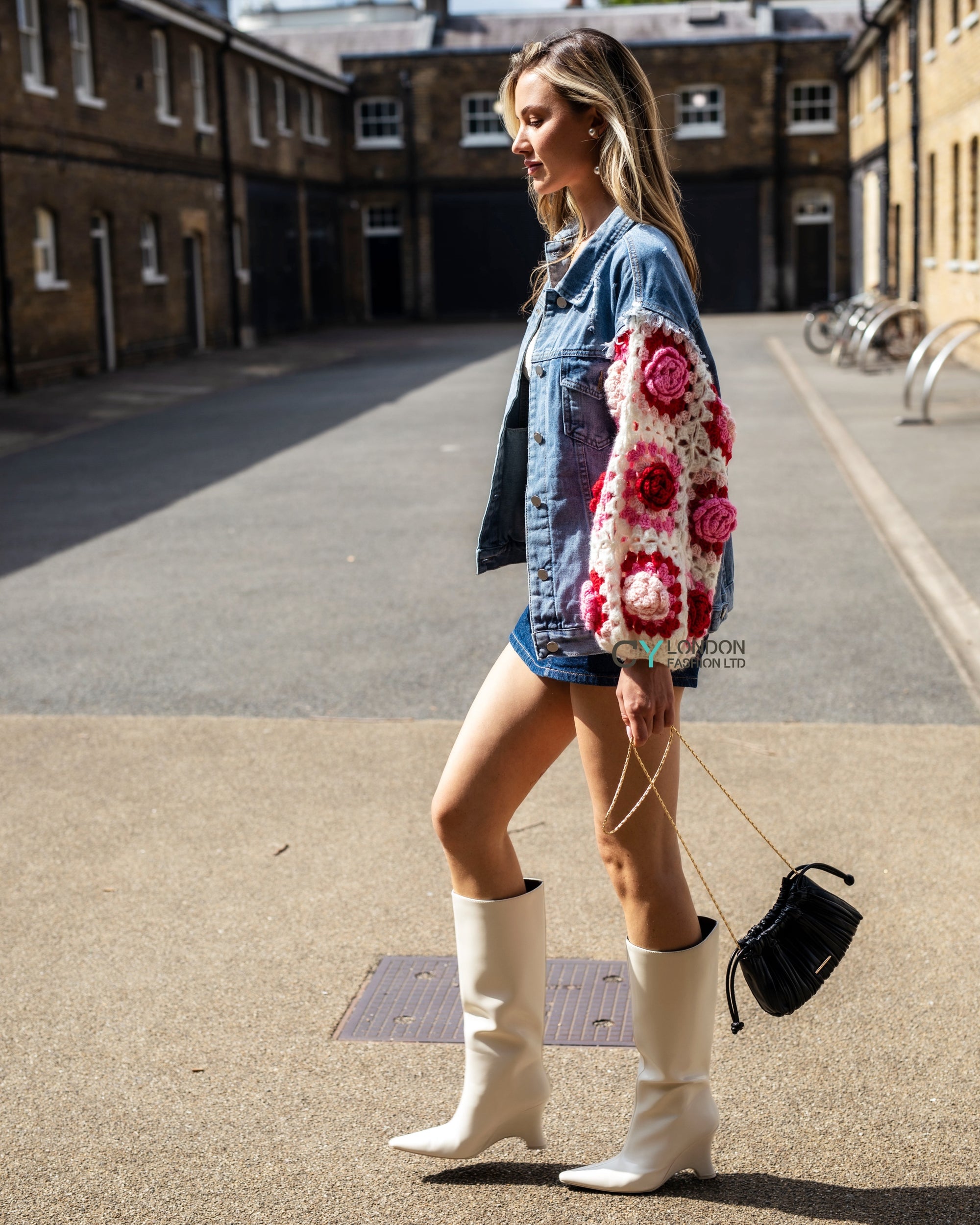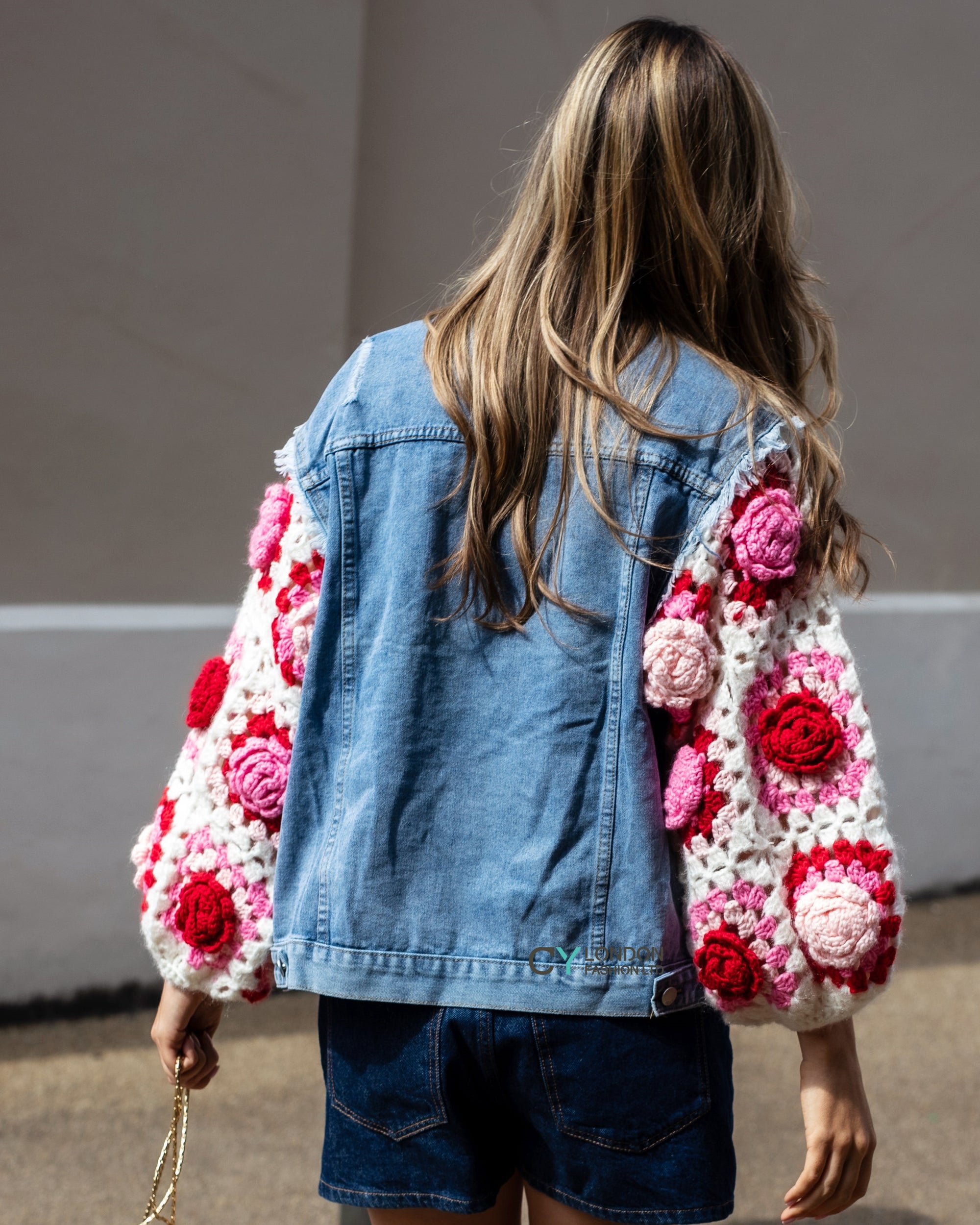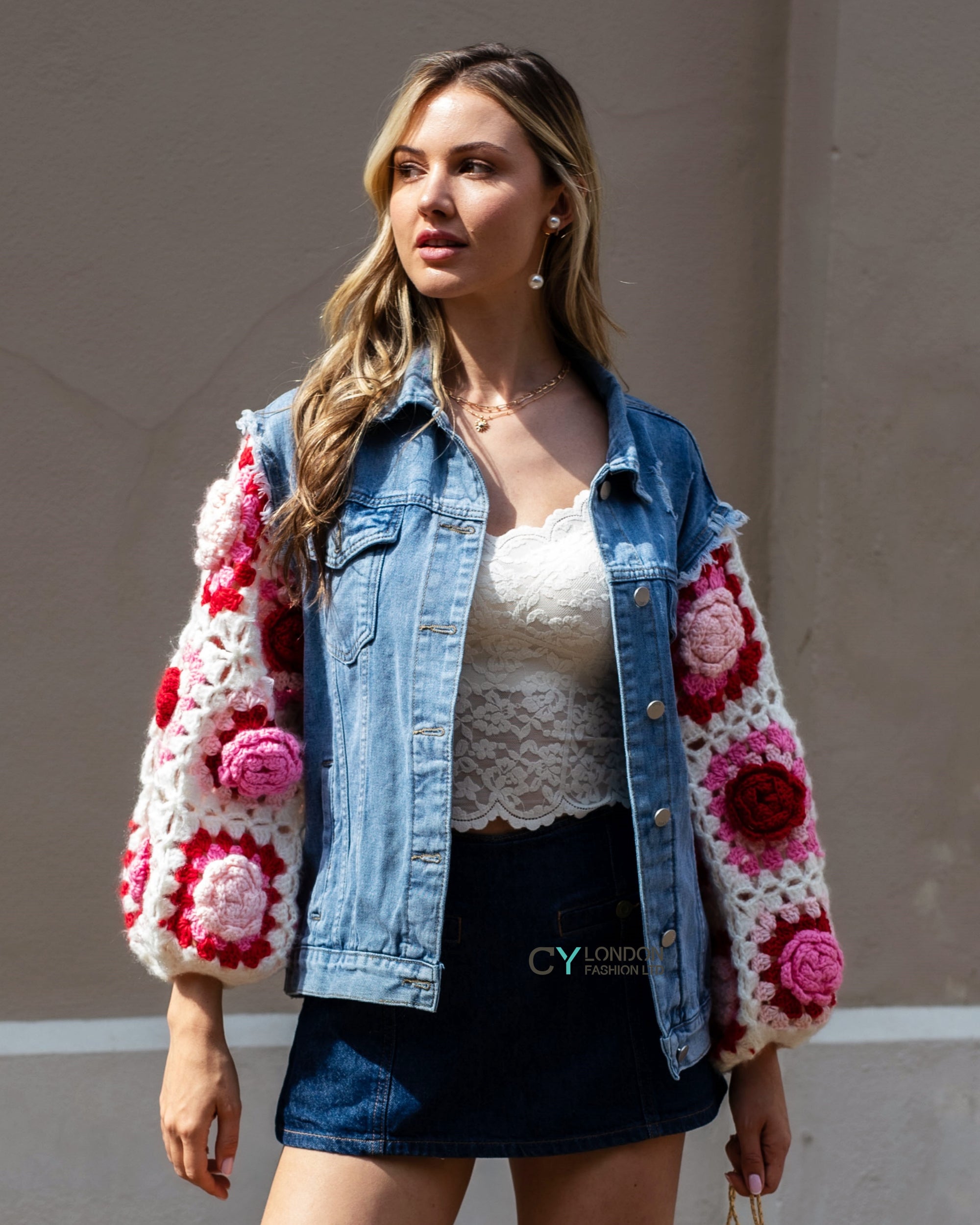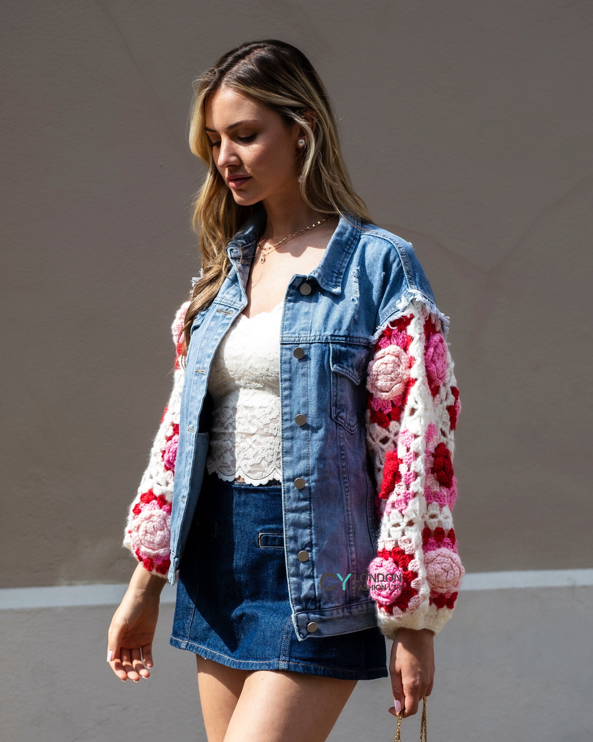 Handknit Floral Patten Sleeves Denim Jacket in Pink
