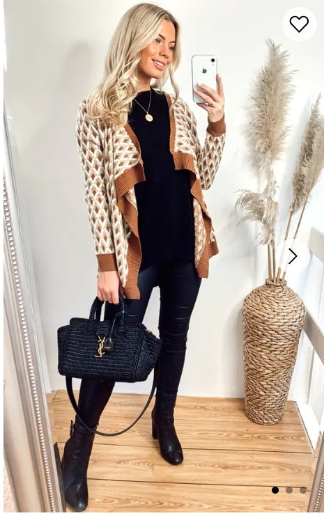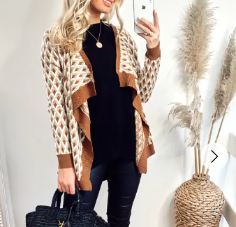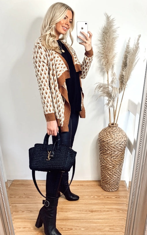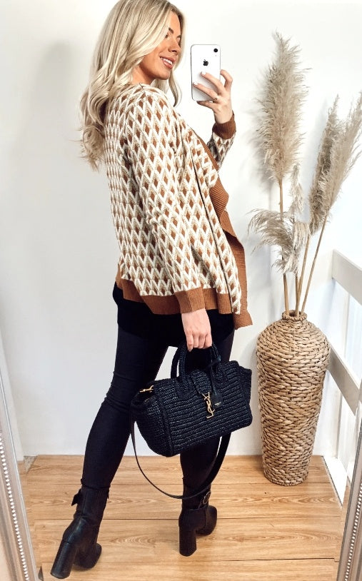 Metallic Gold Trims Stripe And Diamond Print Wool Blend Knitted Cardigan