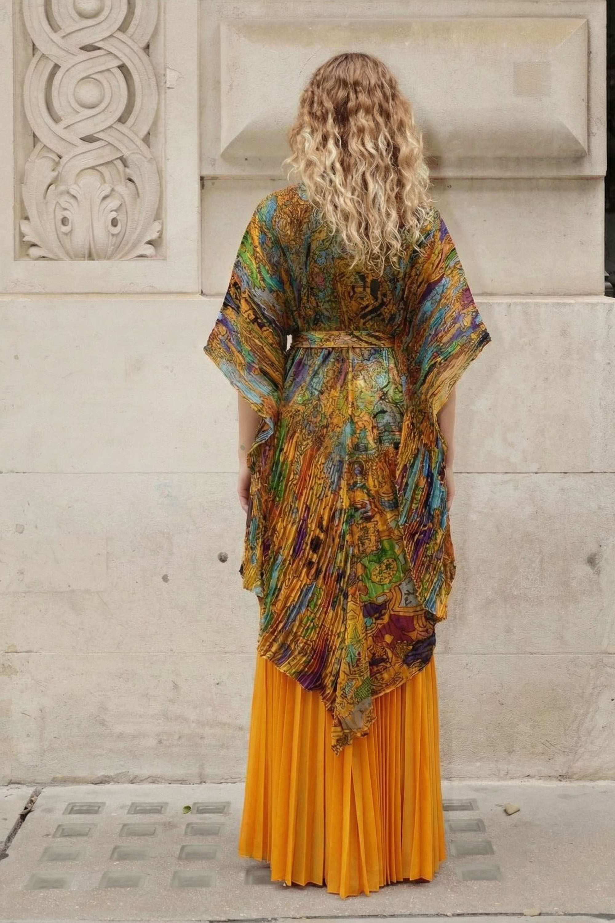 Pleated long dress with organza pleated cape sleeves in Hot Pink