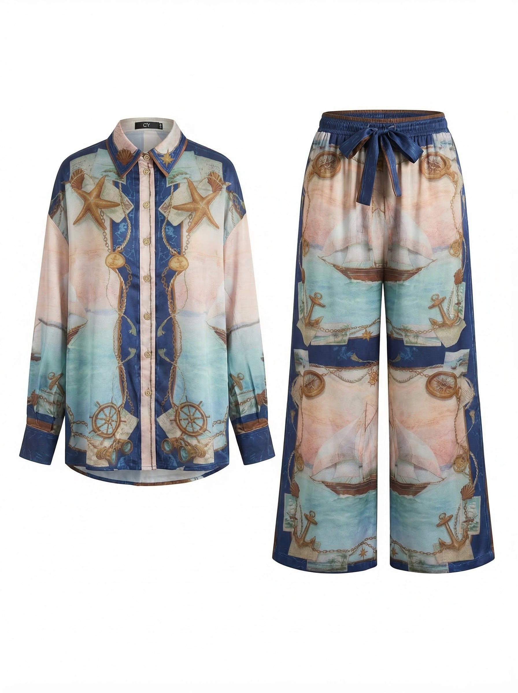 Ocean Treasure Print Shirt & Wide-Leg Trousers Suits In Blue