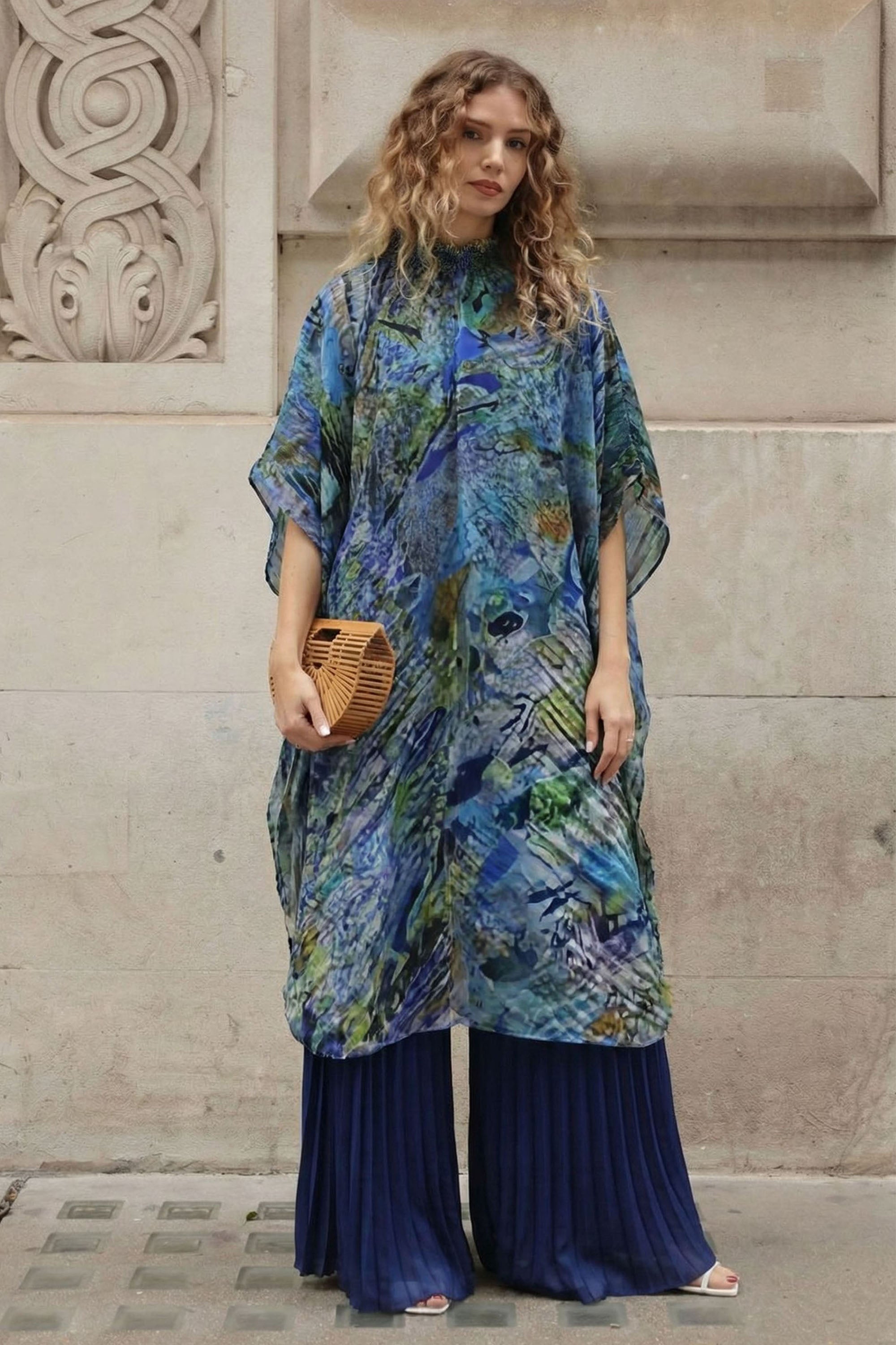 Full Pleated Floral Print Shirt And Trousers In Blue
