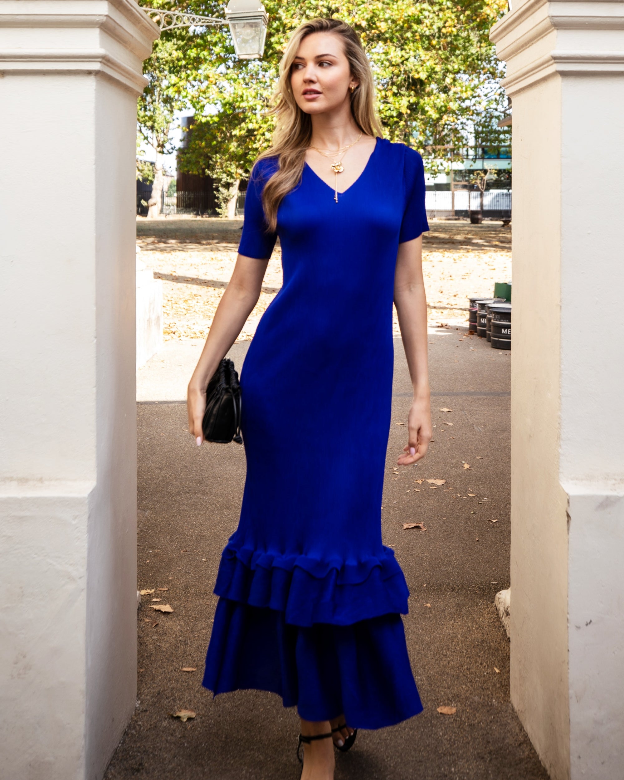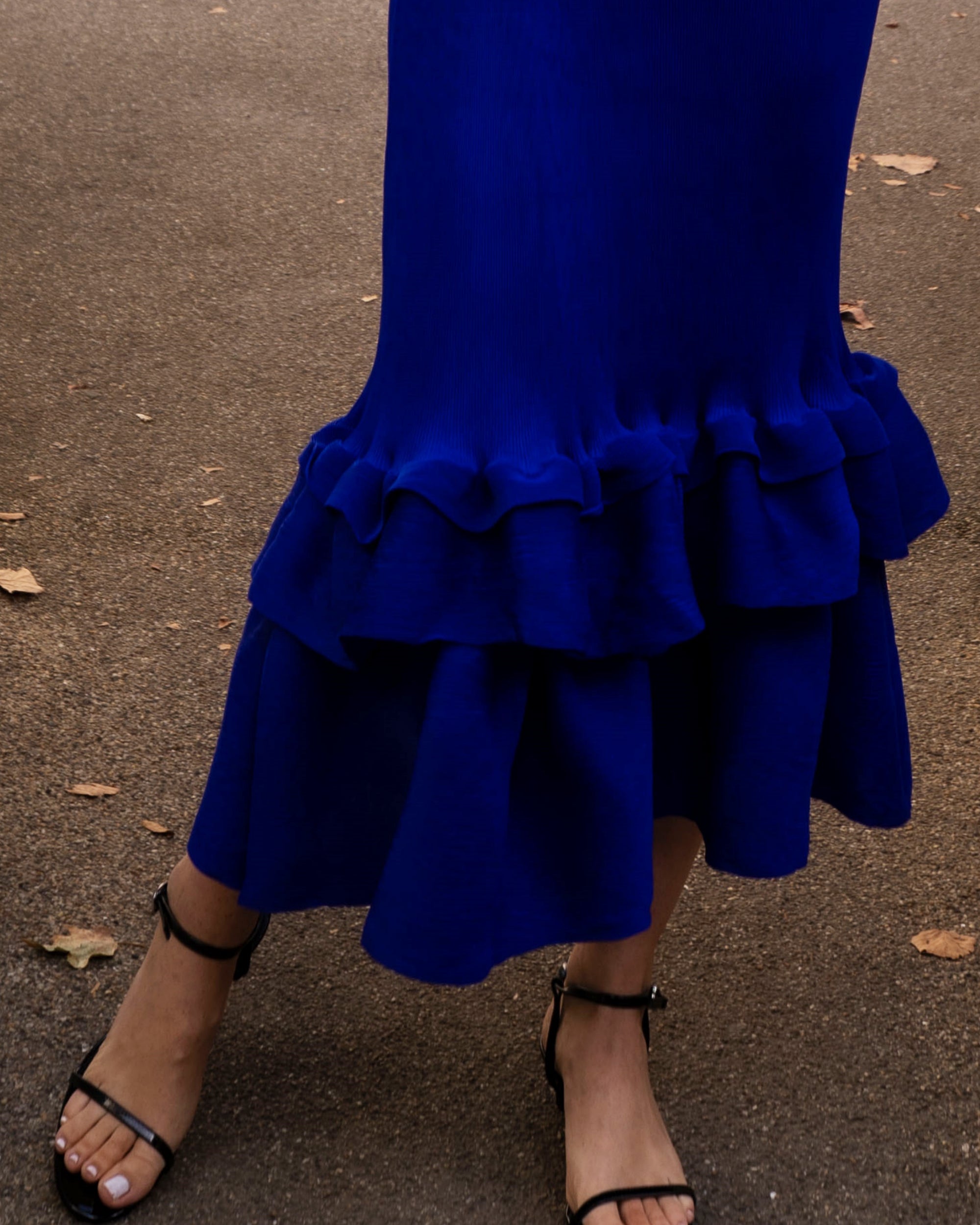 Full Pleated Ruffle Hem Maxi Dress in Royal Blue