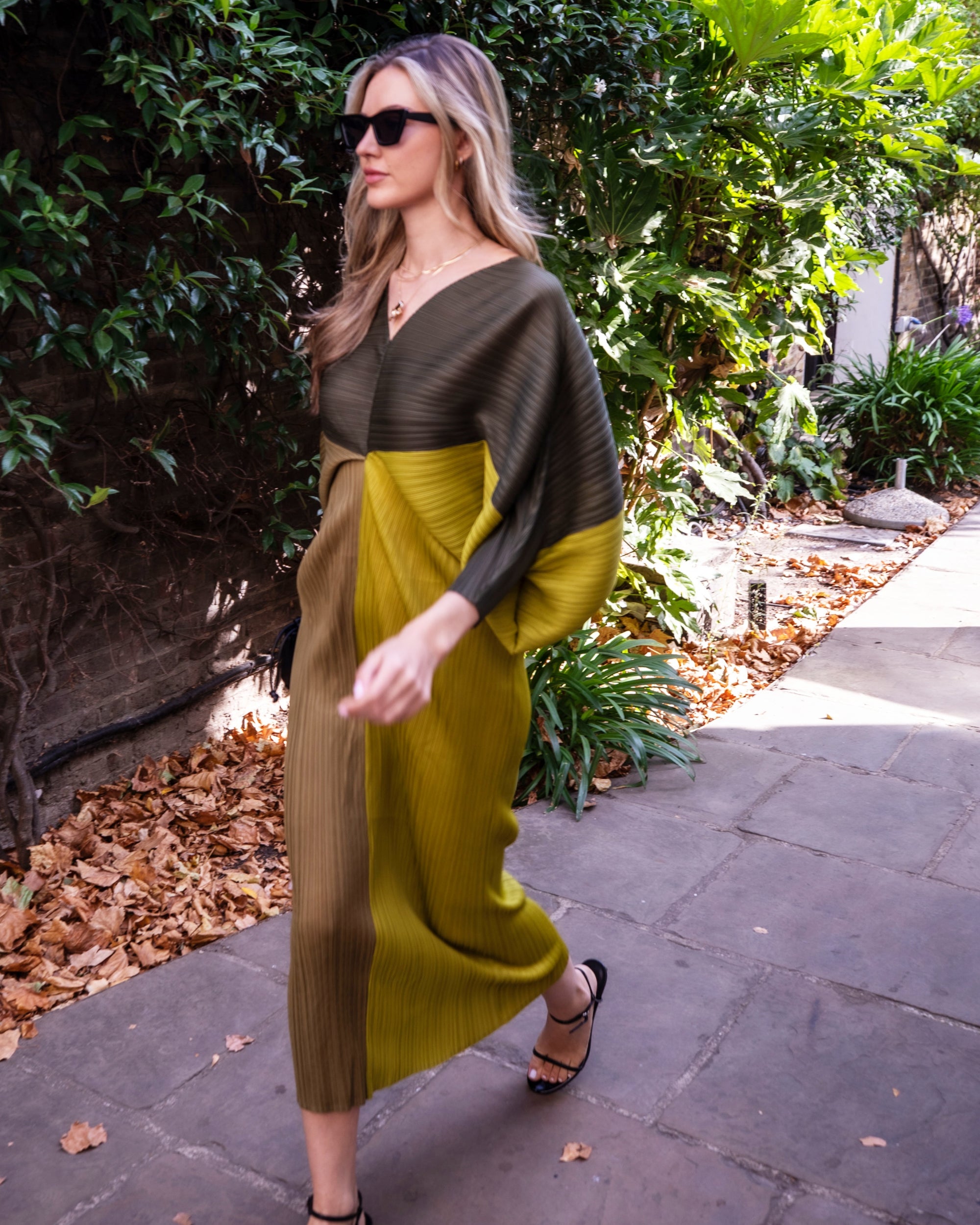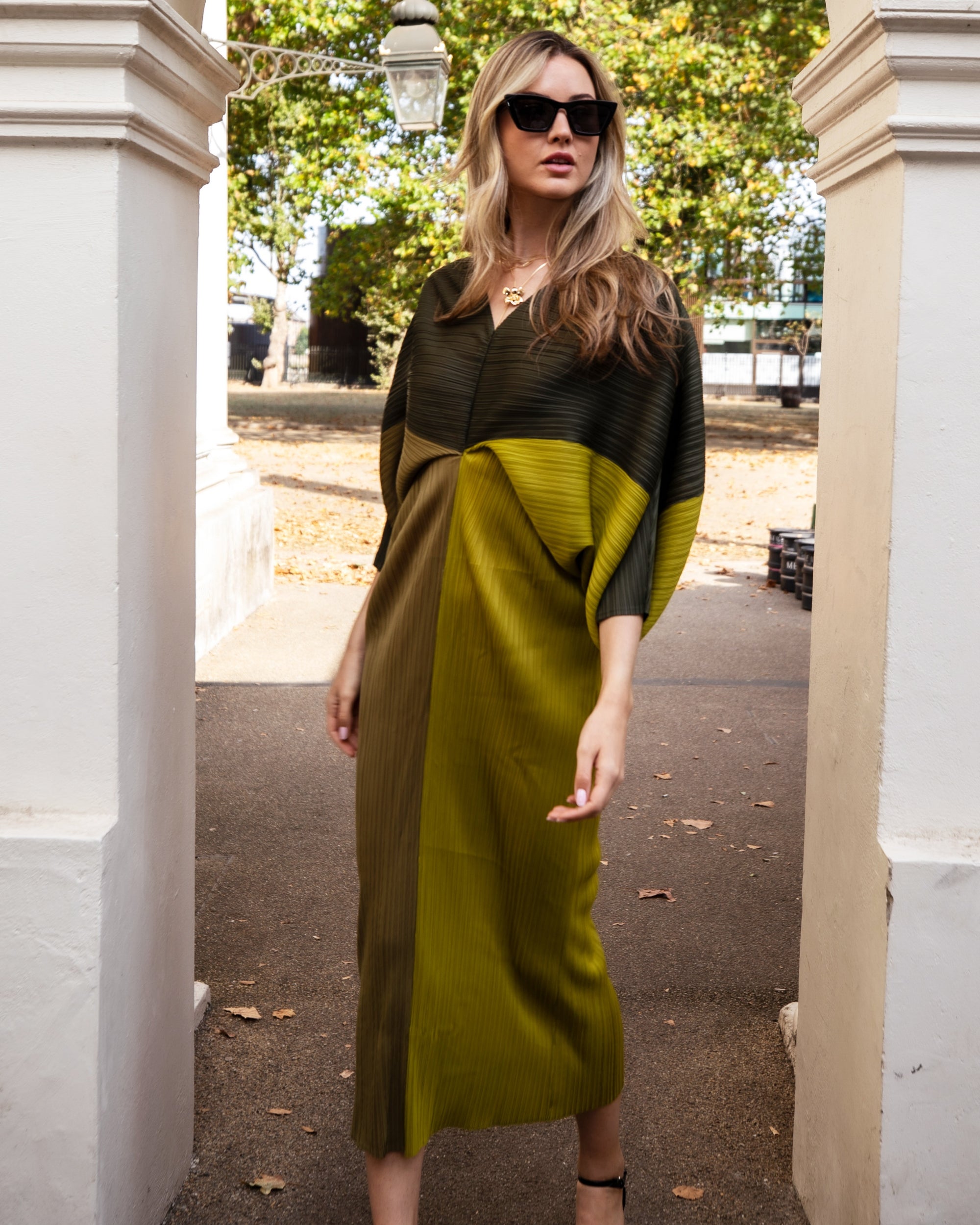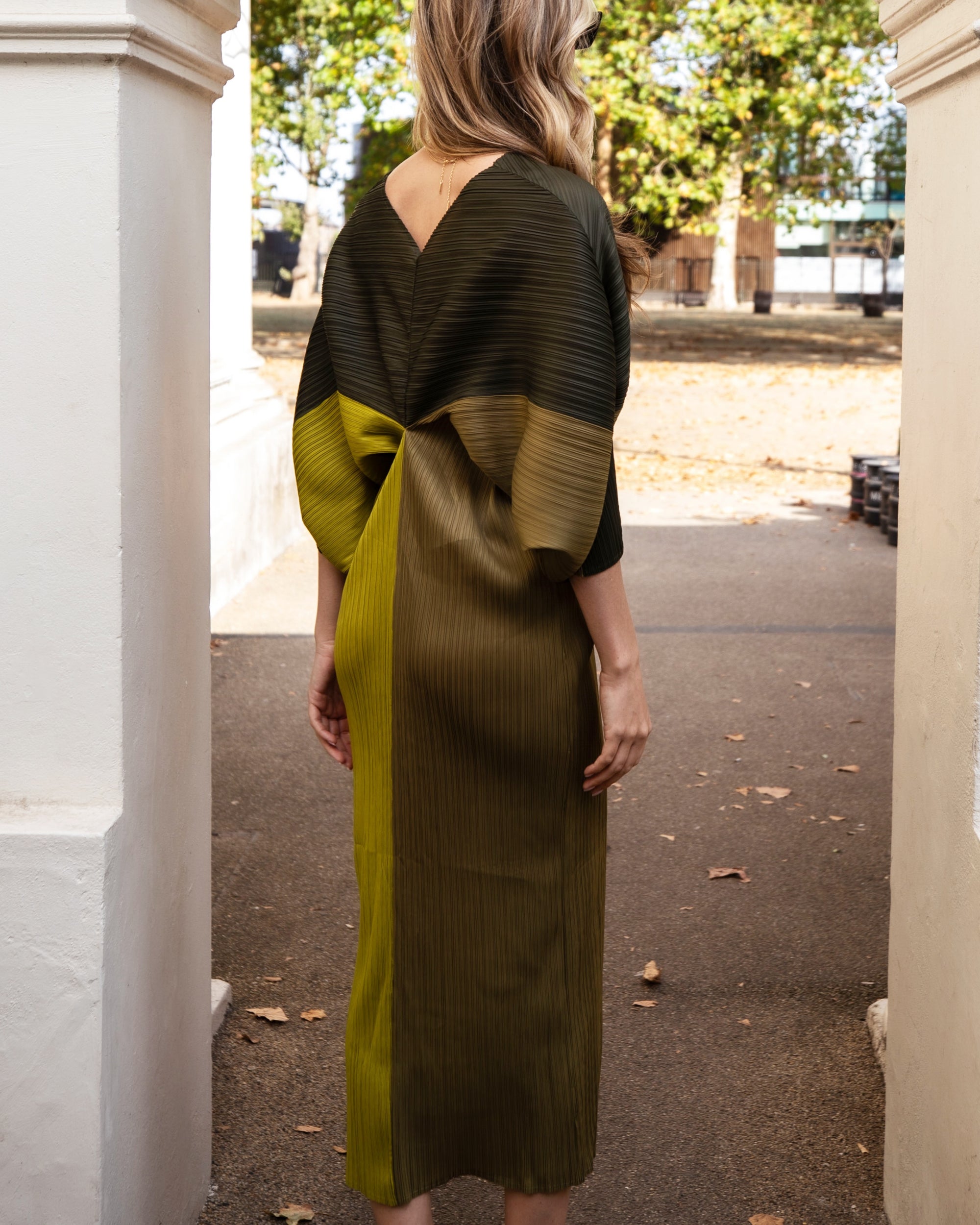 Green color blocking Print Pleated Dress in Kimono sleeves