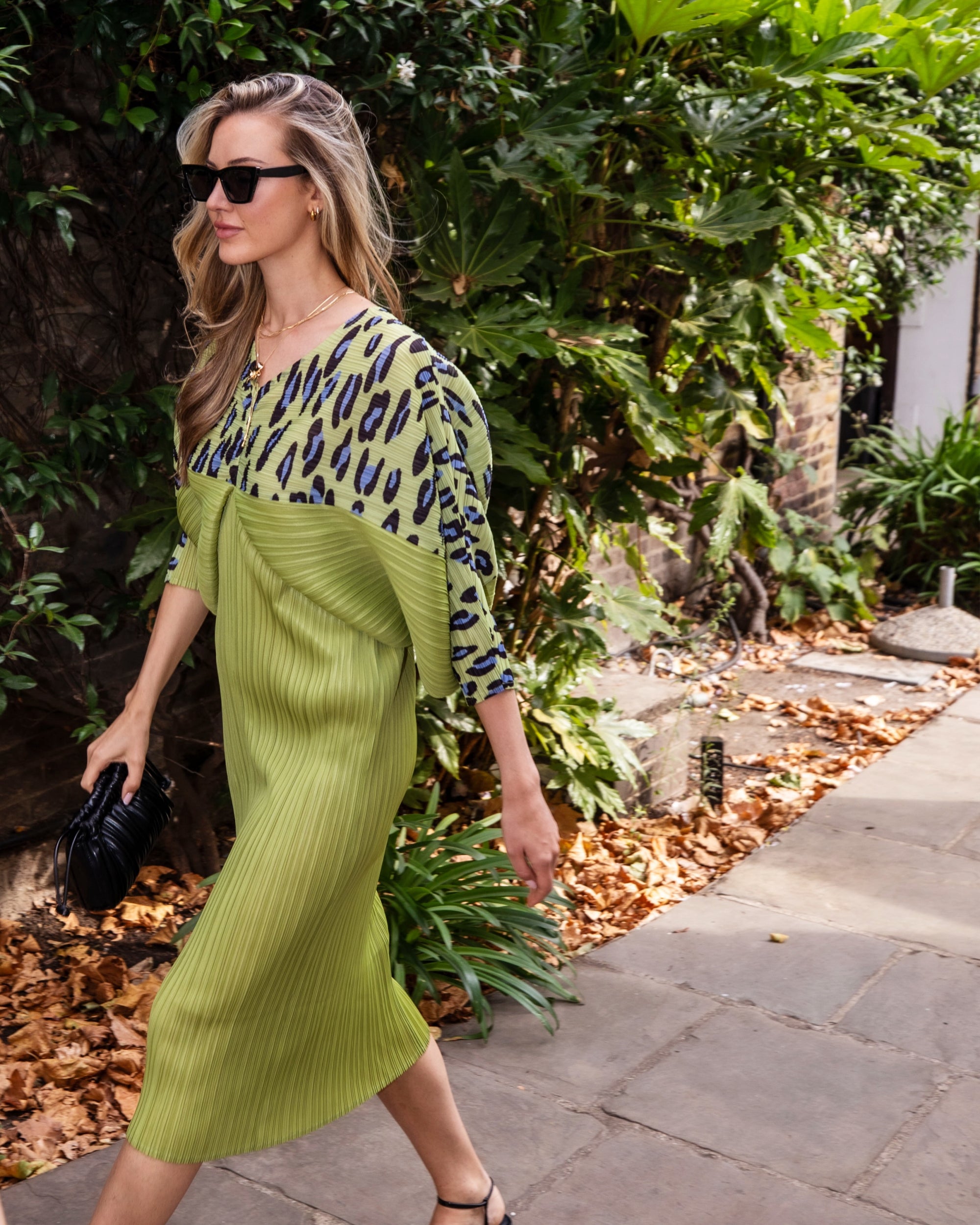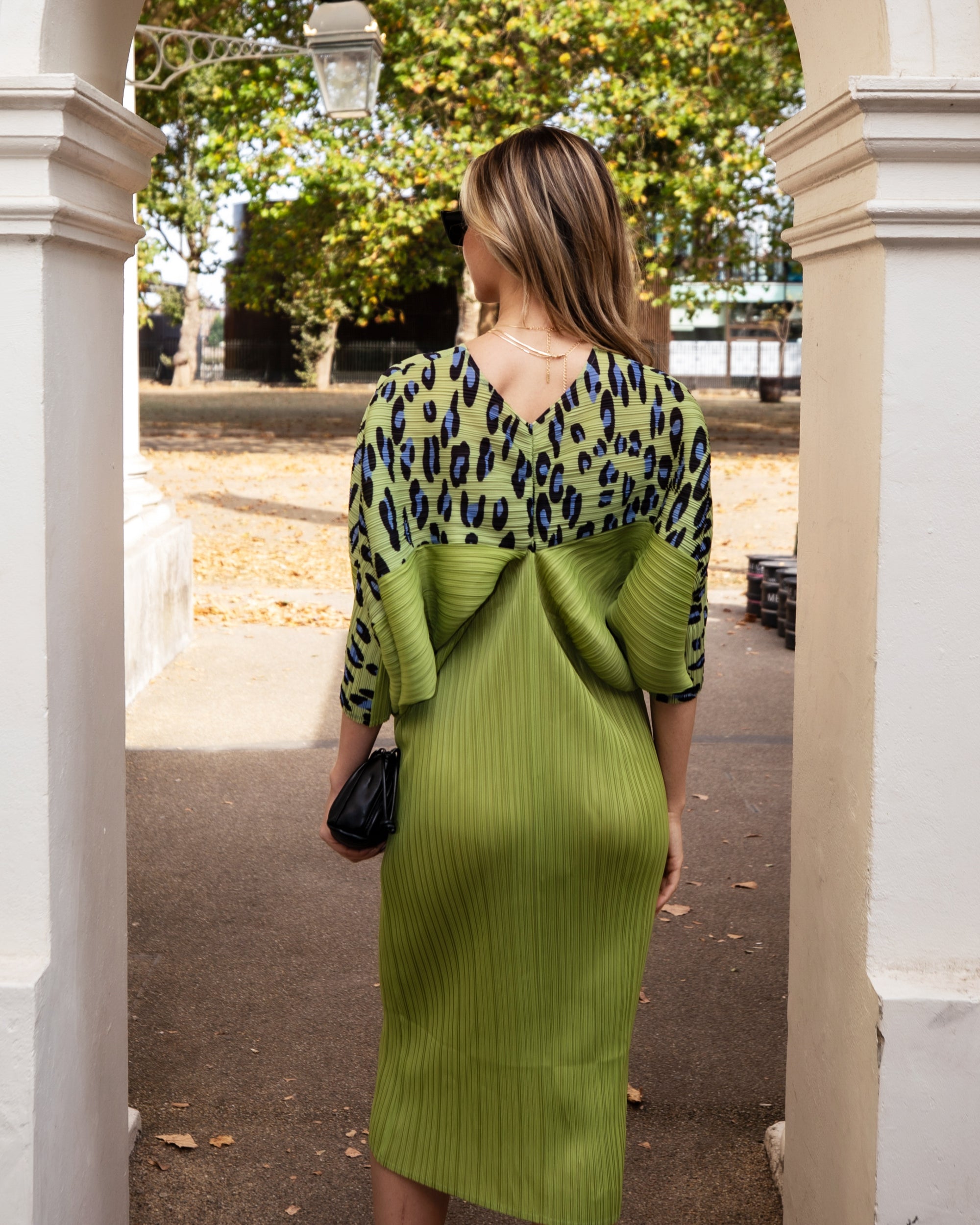 Green Leopard print color blocking Print Pleated Dress in Kimono sleeves
