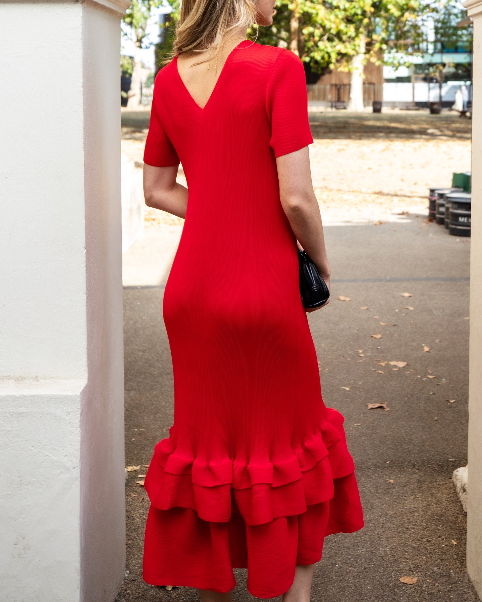 Full Pleated Ruffle Hem Maxi Dress in Red