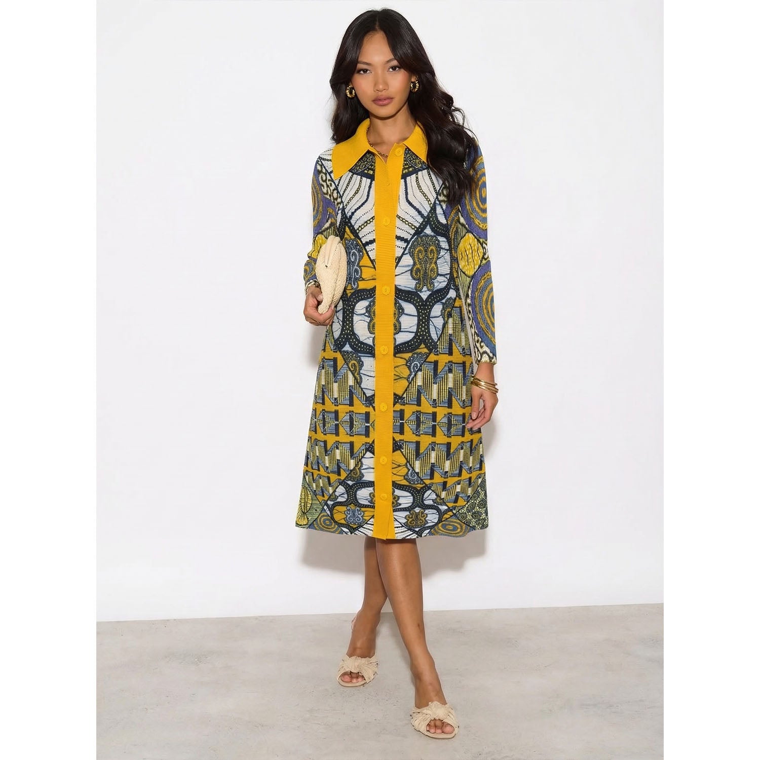 Golden Geometry Print Shirt Dress with Contrast Yellow Collar