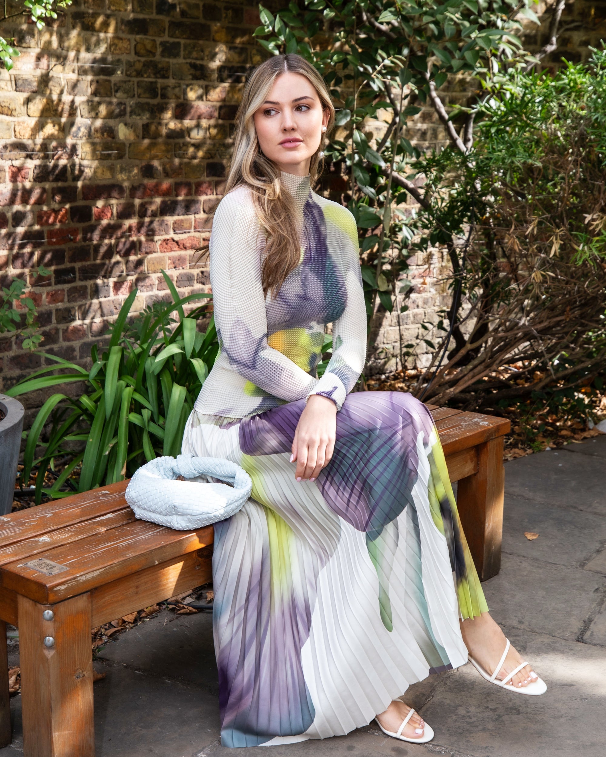 Floral Print Full Pleated Printed Top And Midi Skirt In White