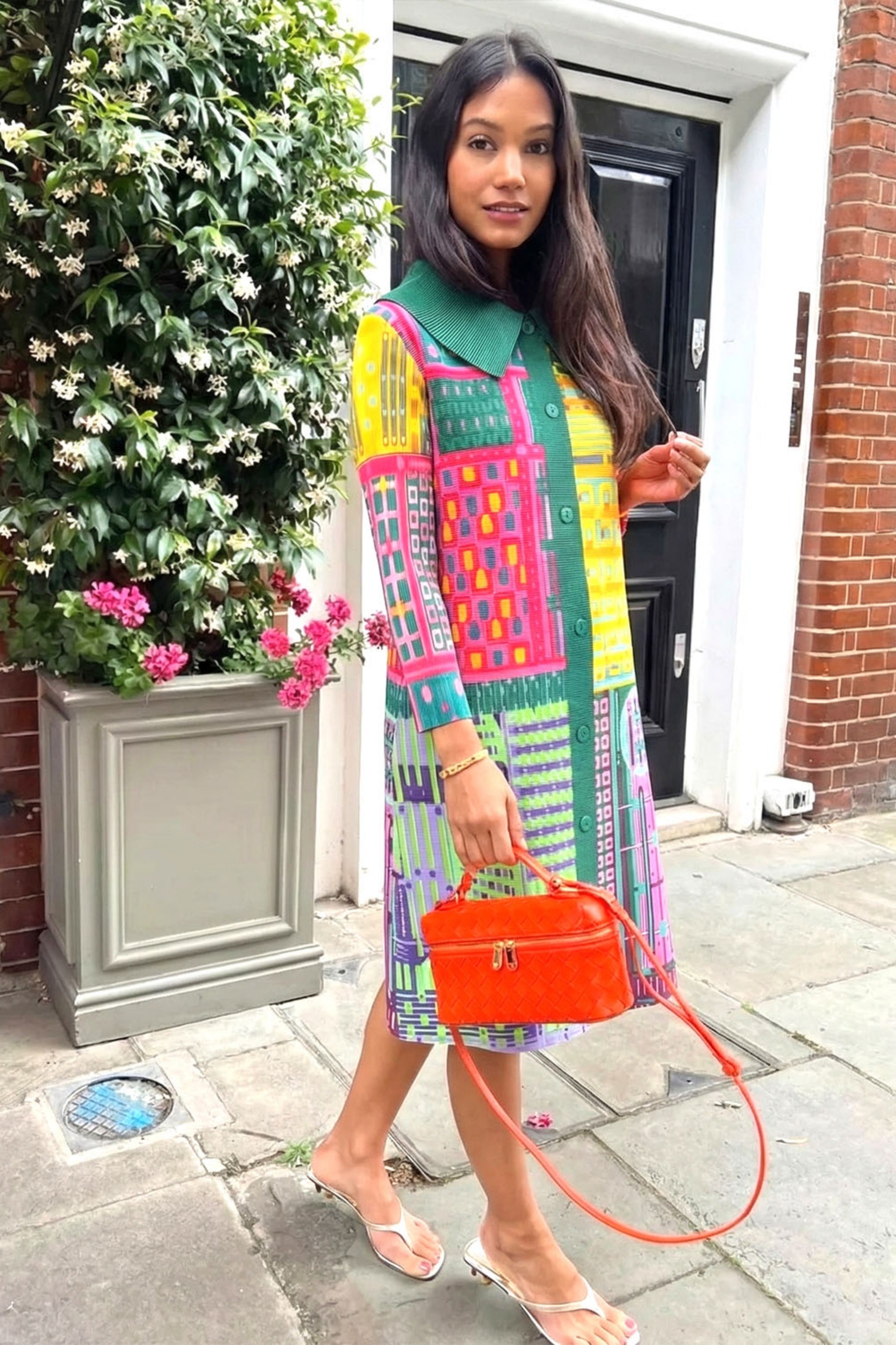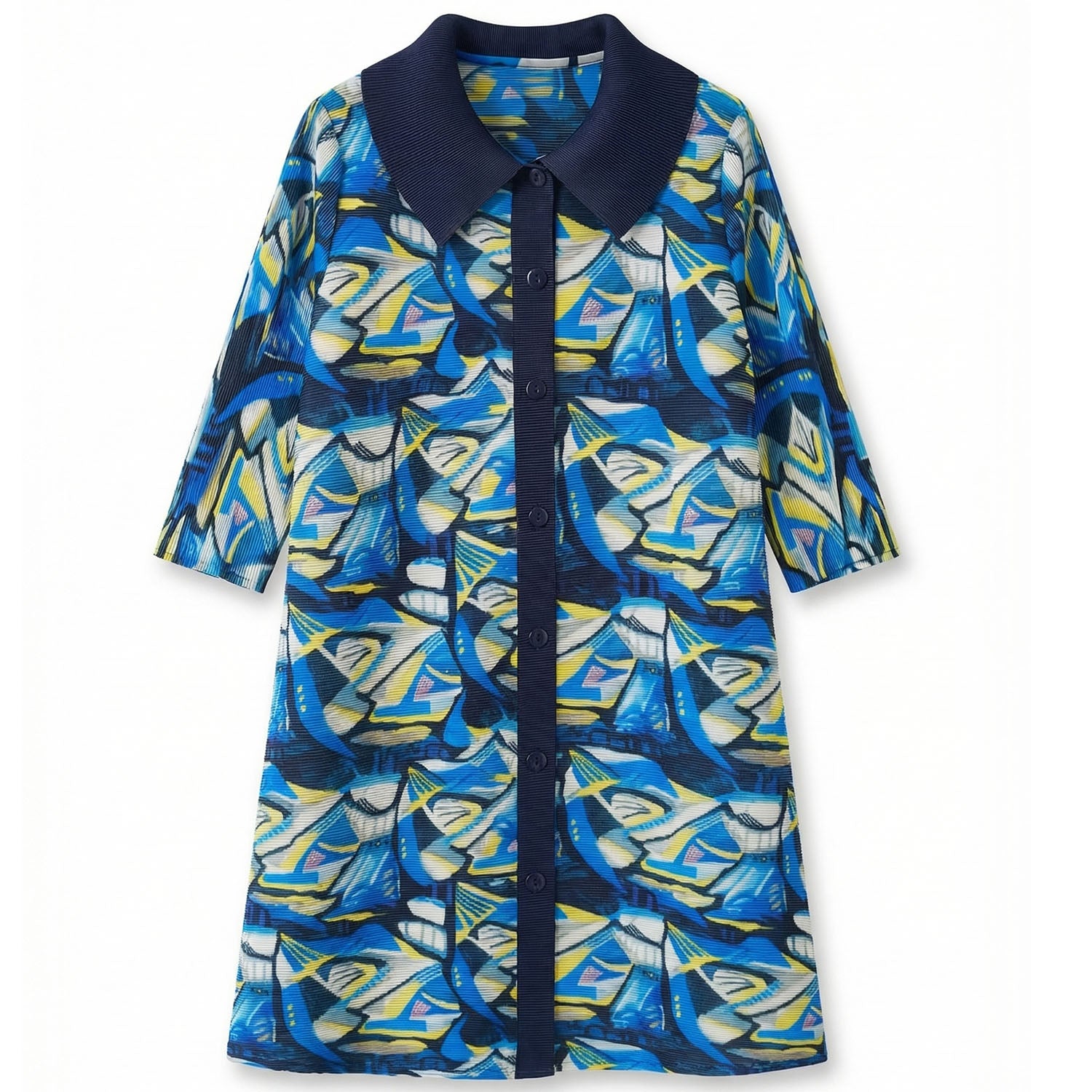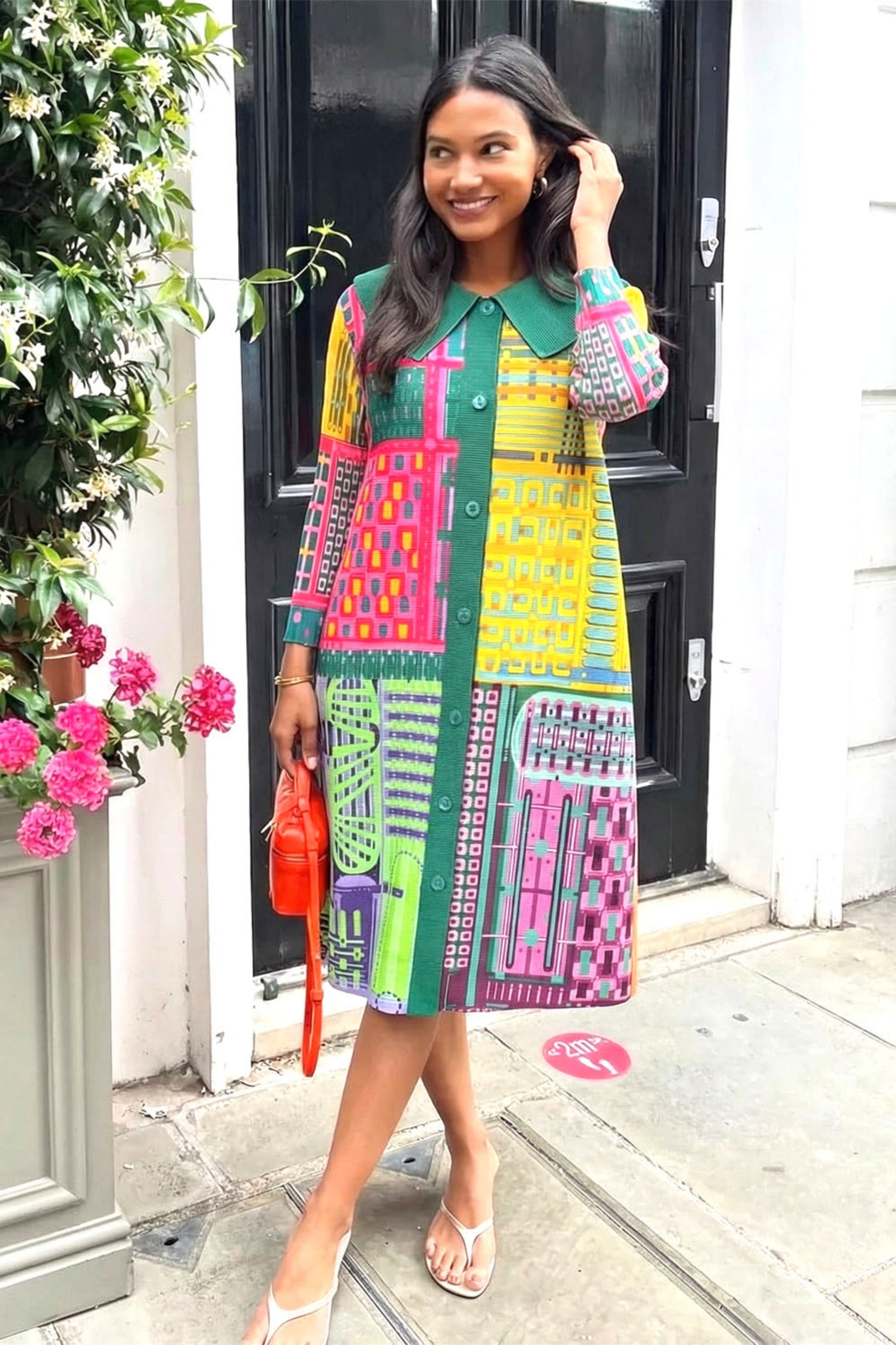 Modern Cityscape Print Shirt Dress with Contrast Green Collar
