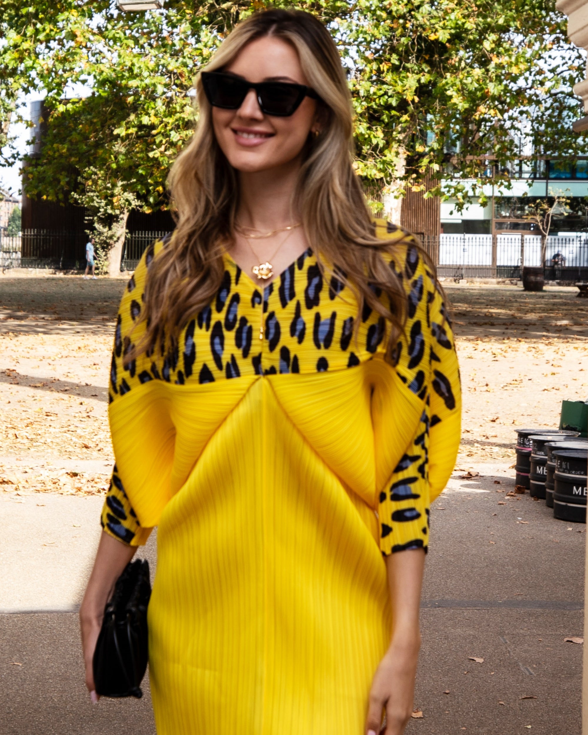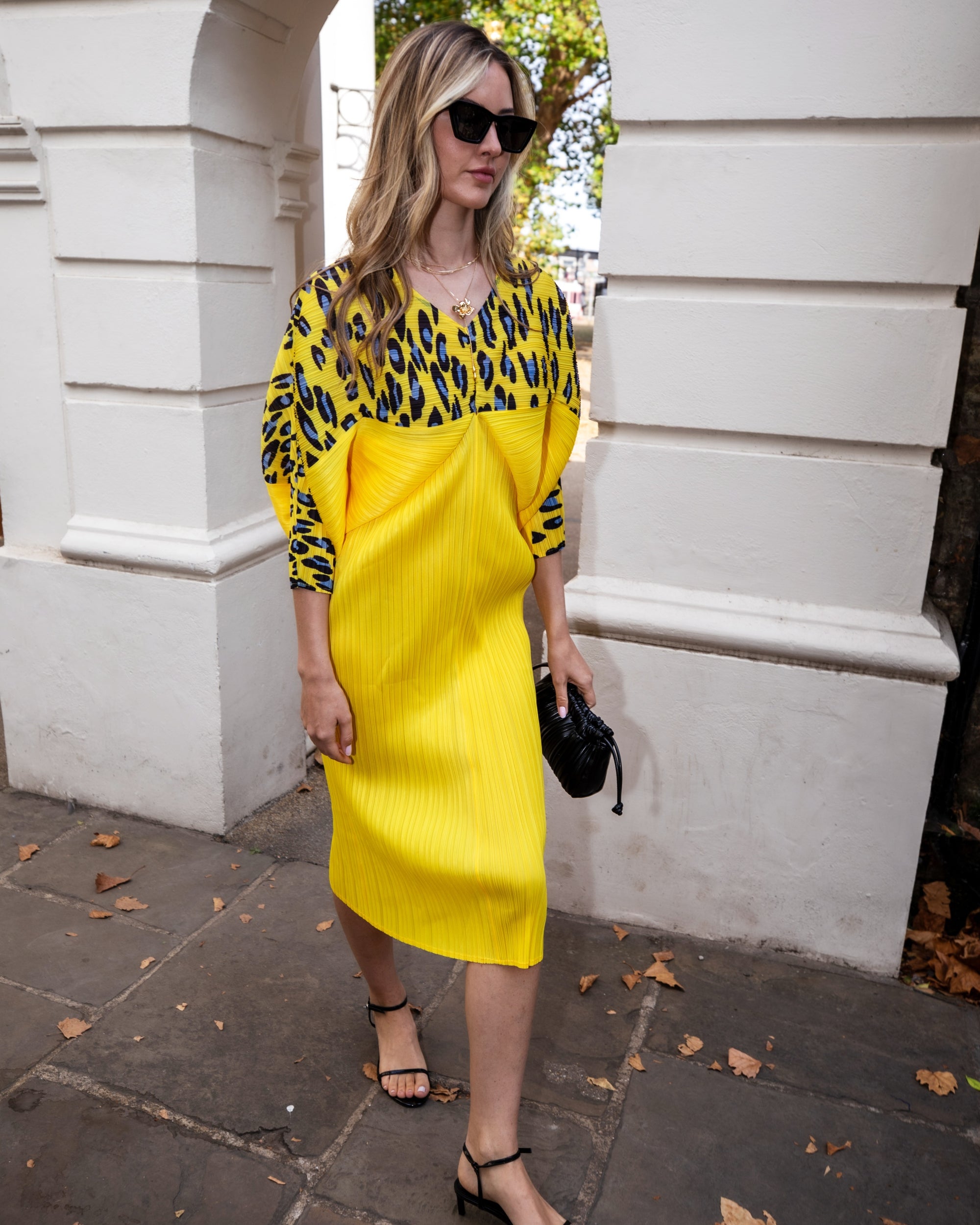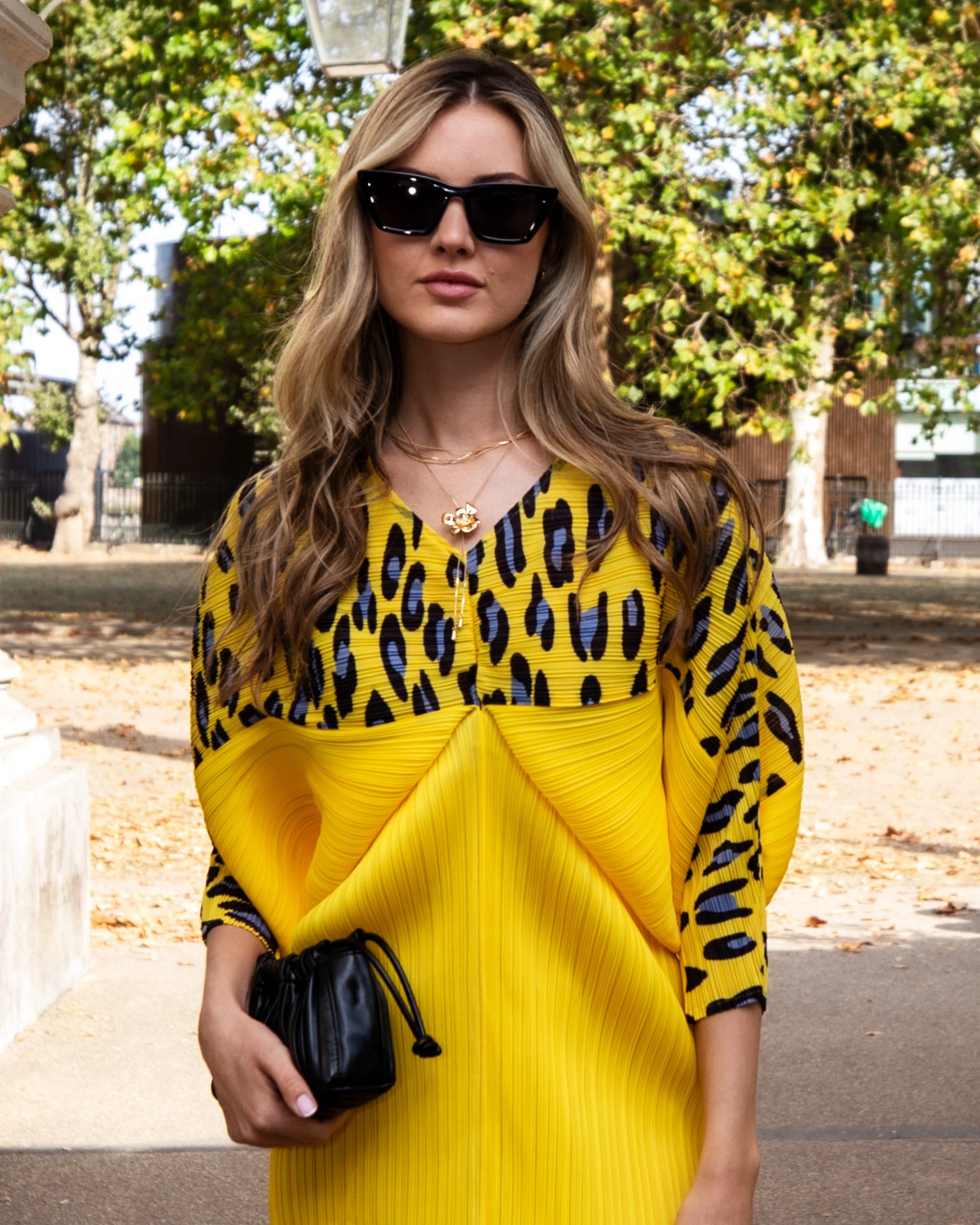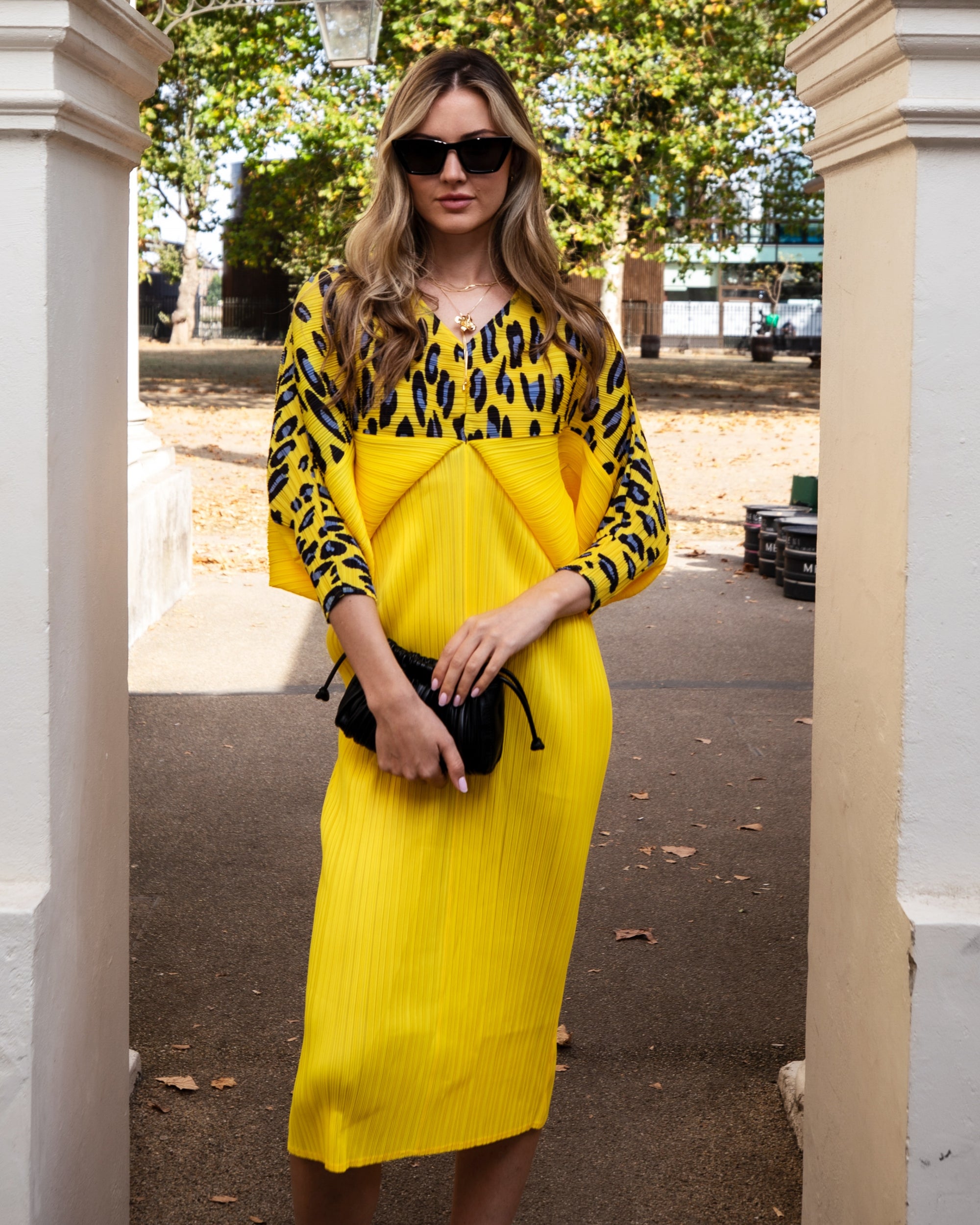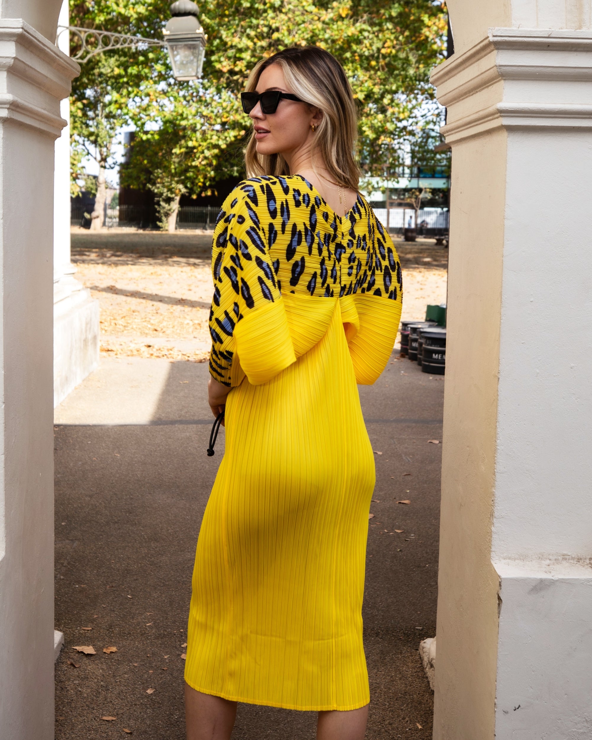 Yellow Leopard print color blocking Print Pleated Dress in Kimono sleeves