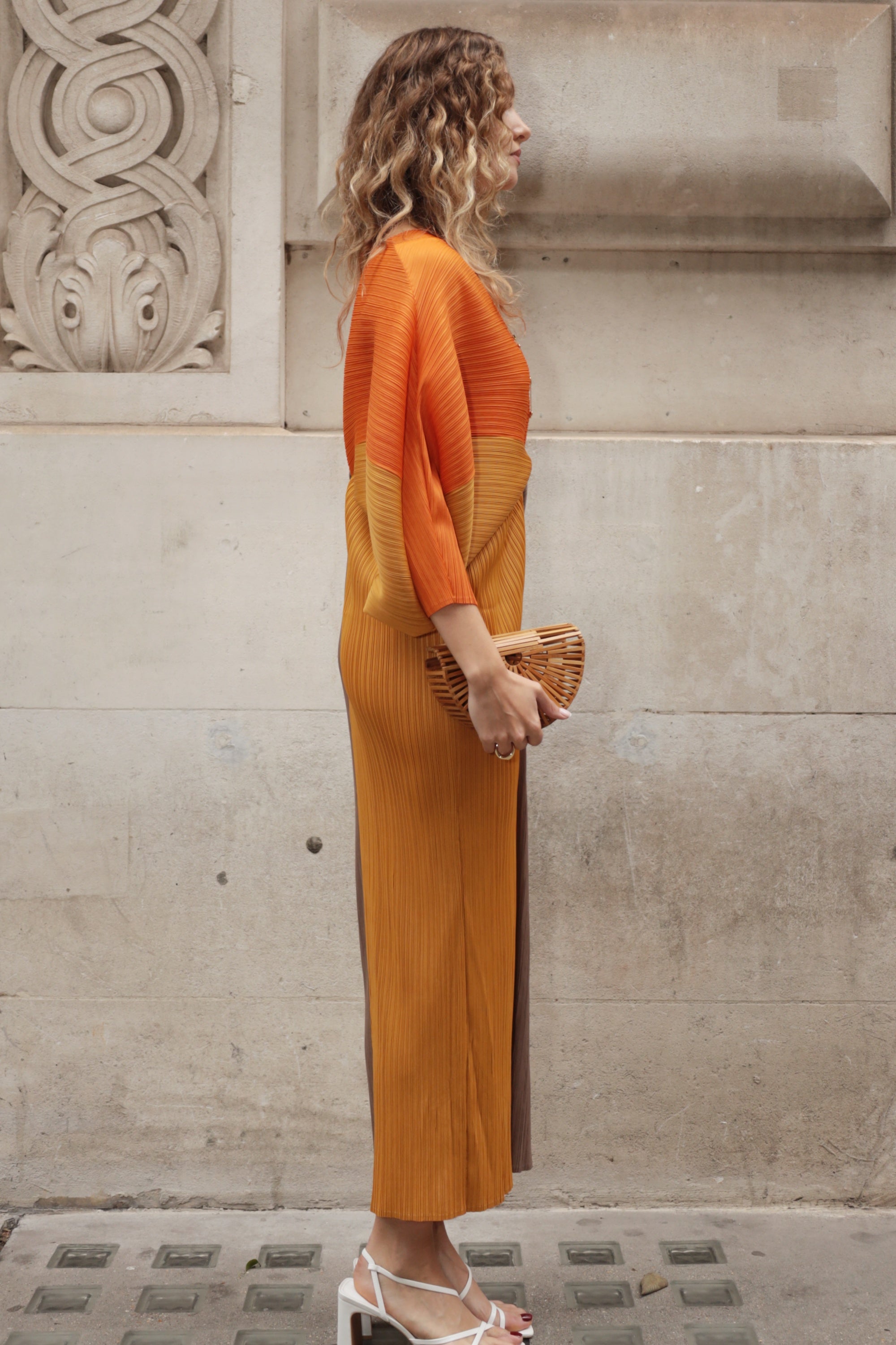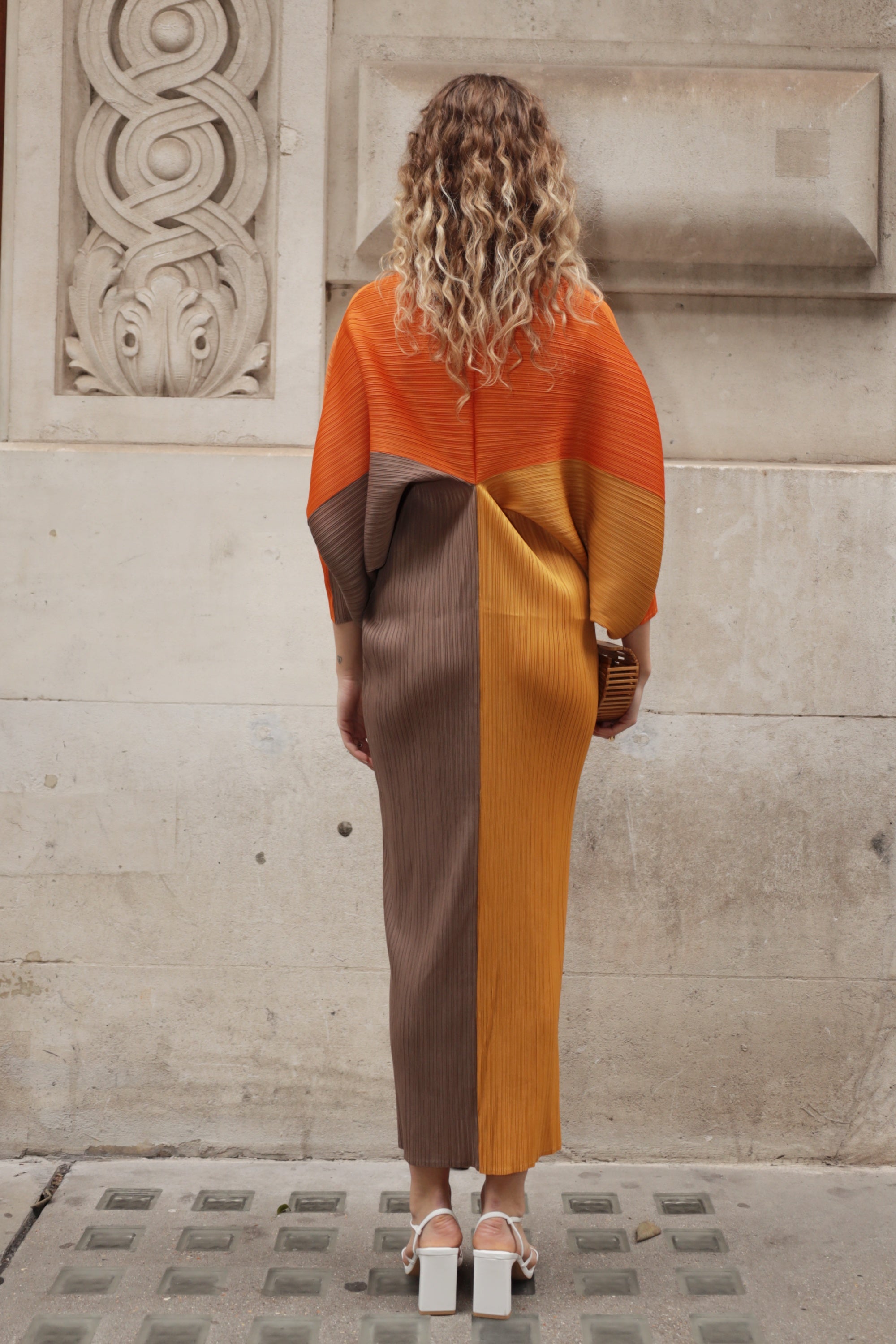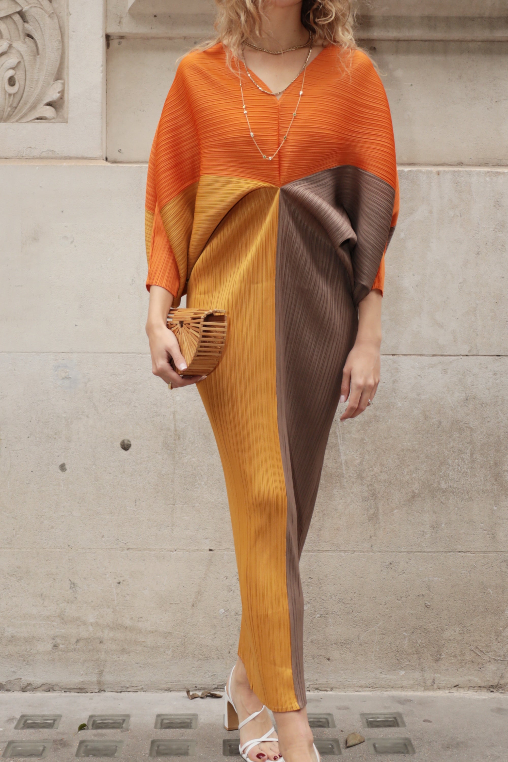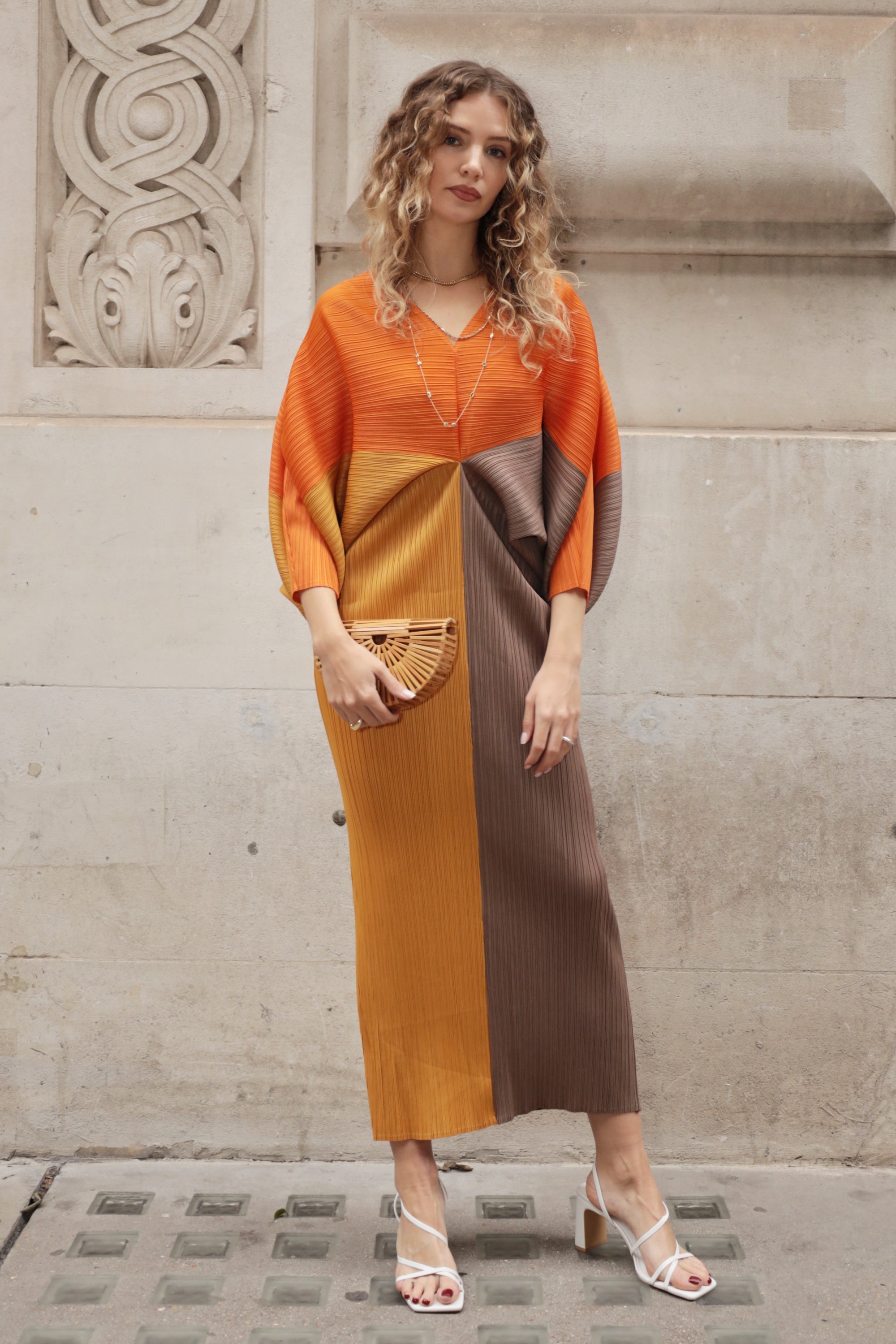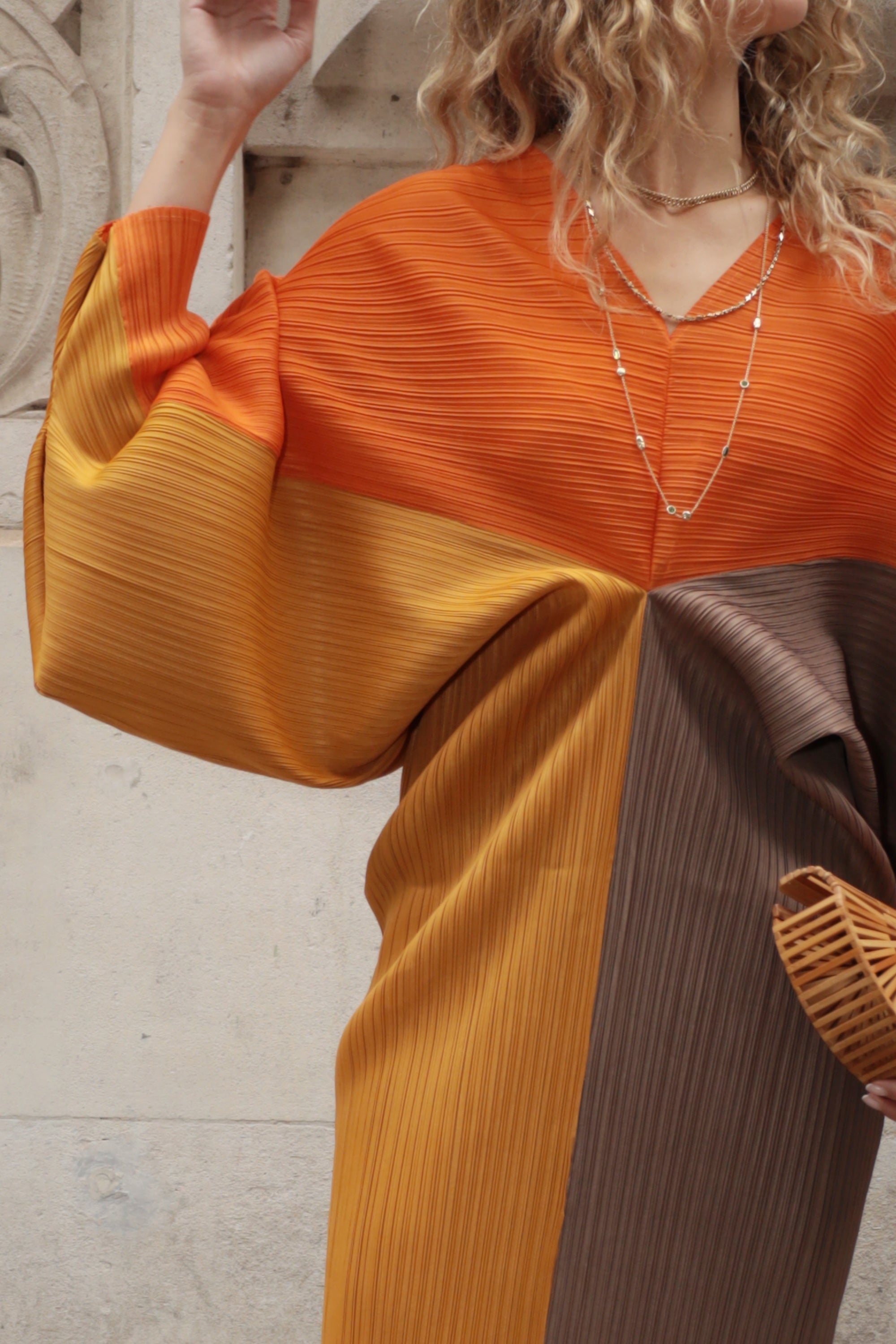 Orange color blocking Print Pleated Dress in Kimono sleeves
