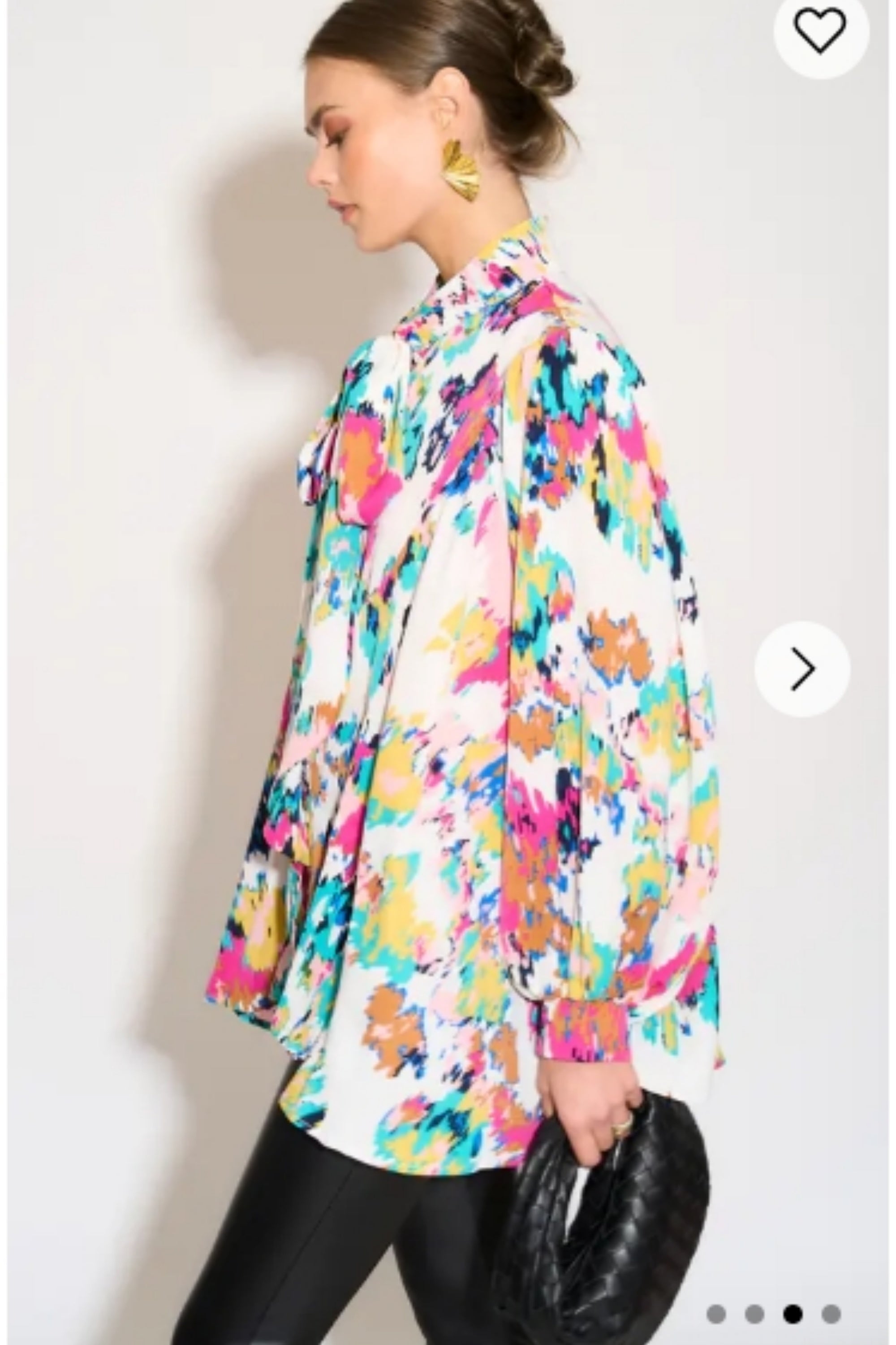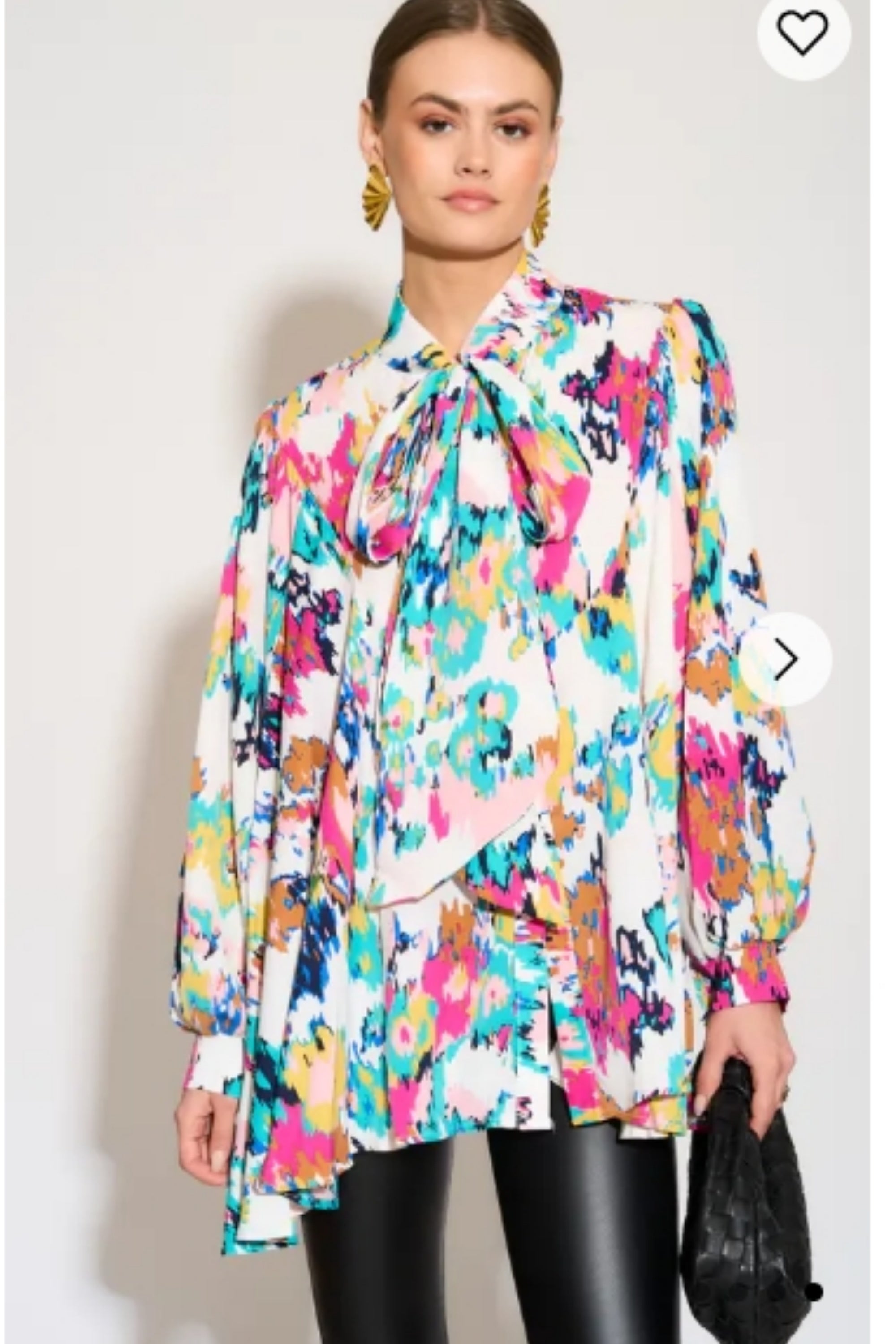 Wild Bloom multi color print oversized shirt with tie up bow design in White