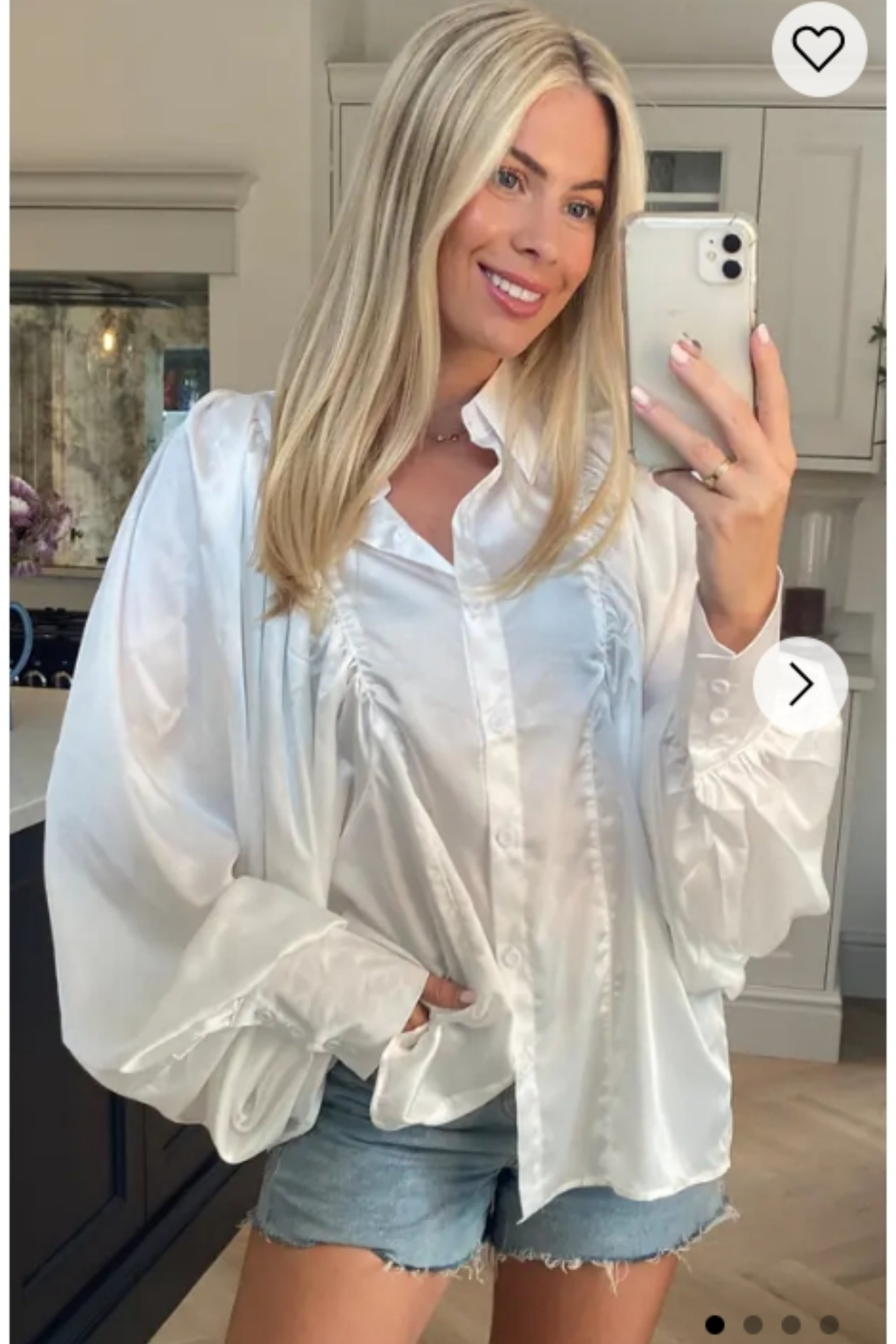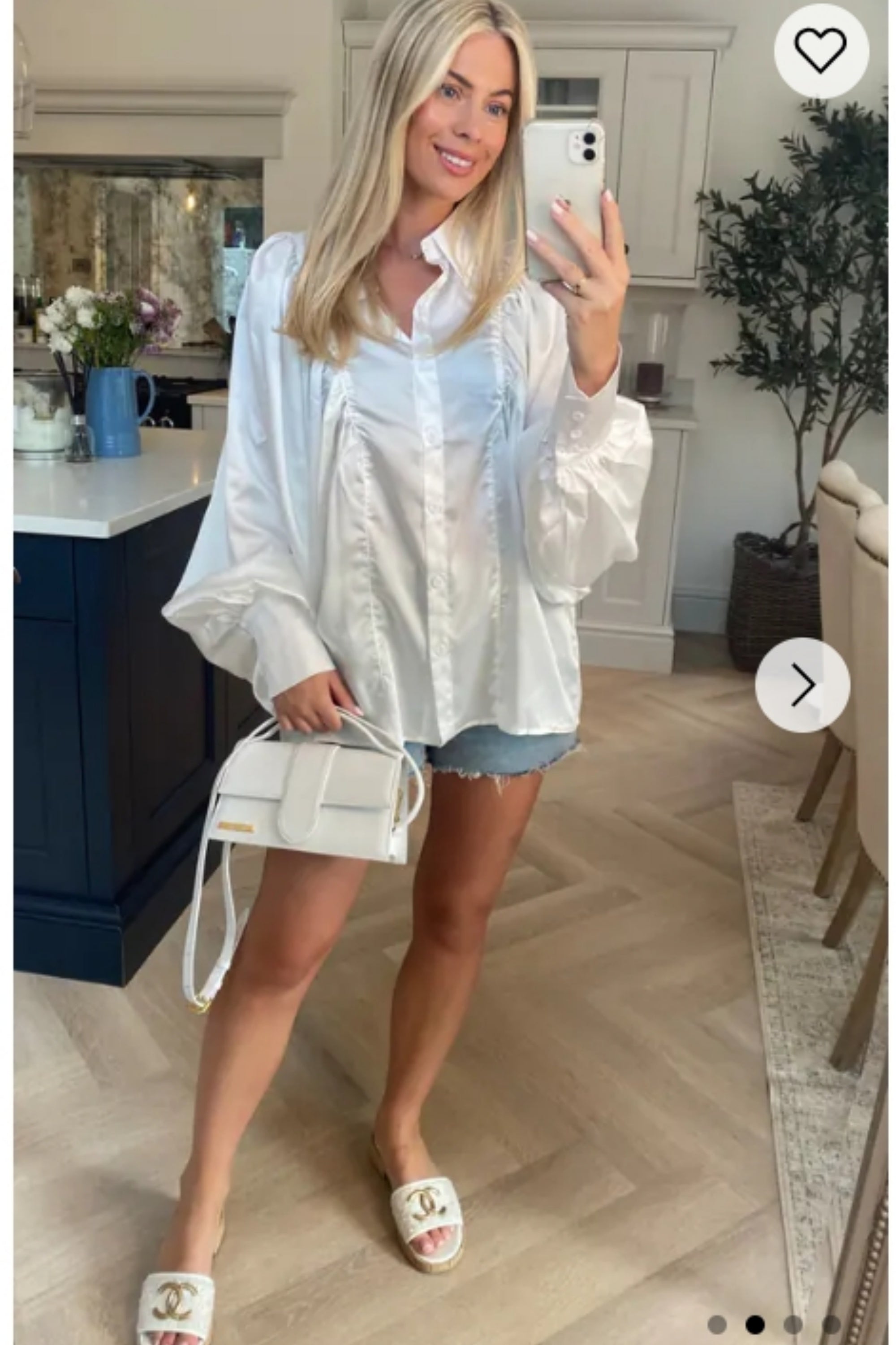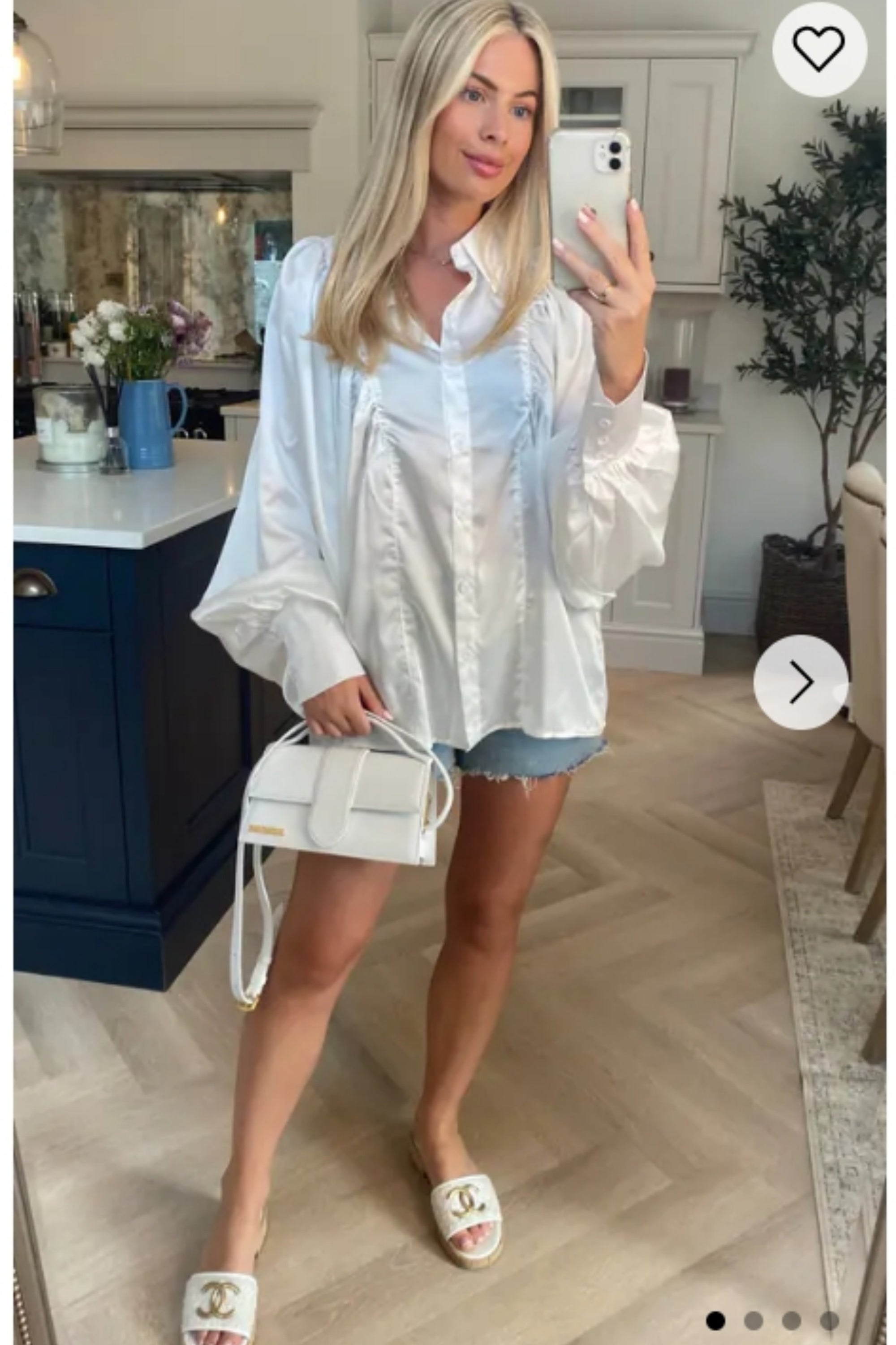 Pleated ruffles with multi dimoned stone embellished sleeves design organza shirt in white